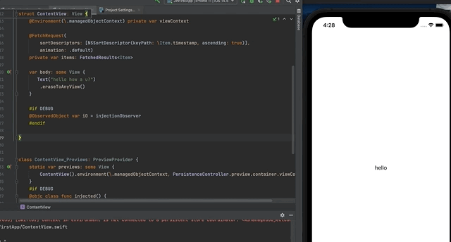 검색해보니 appcode에서는 에뮬레이터를 키고 따로 플러그인을 설치해야 preview처럼 화면이 자동으로 변경되는 걸 구현할 수 있다고 한다.