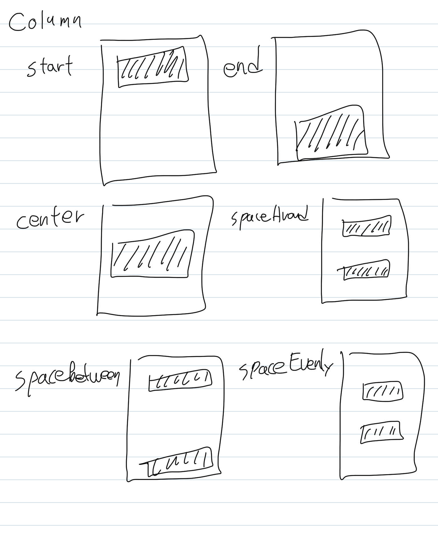 mainAxisSizehas only min, max. why..? idkcrossAxisAlignmentis oposite alignment. It means, in Column it is horizontal alignment, in Row, vertical alignment.verticalDirectionhas only values up and down. It works like order by in sql. asc equal down, desc equal up.Rowhas same attributes asColumn. Both class extendFelxclass.