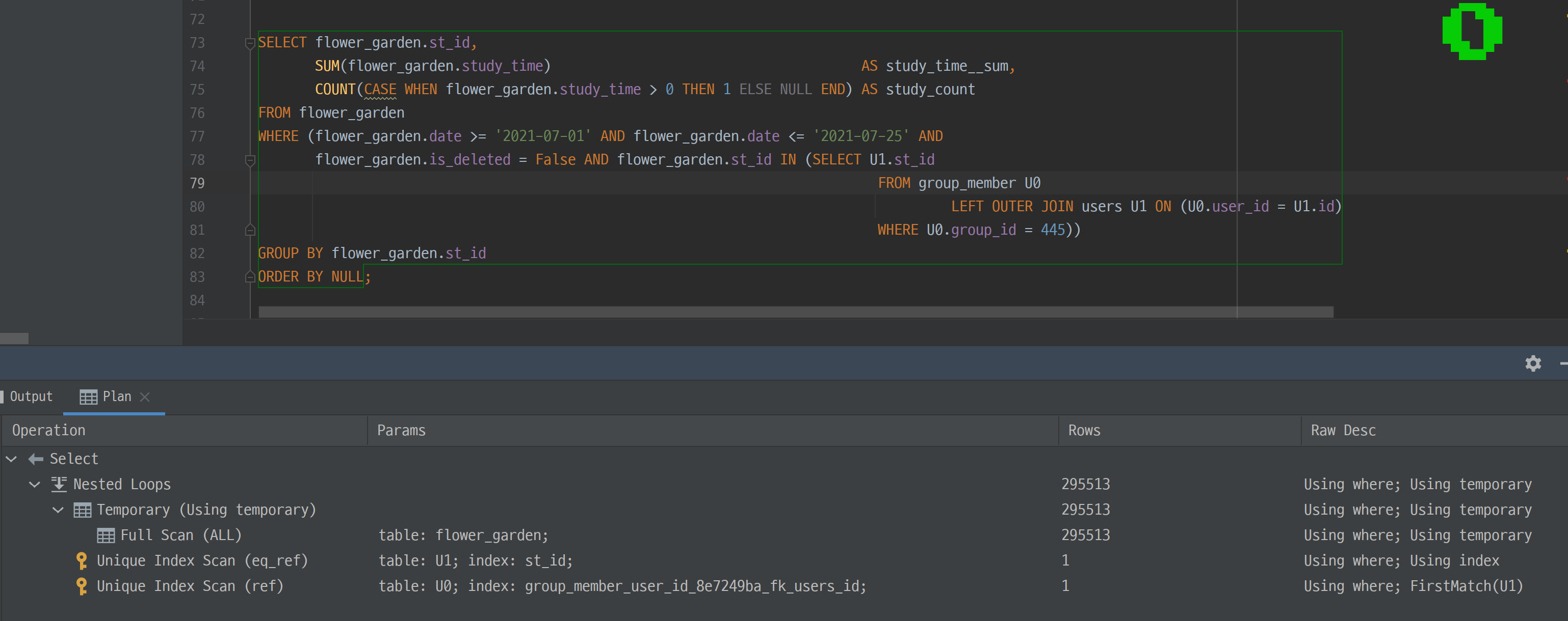 내가 사용하고 있는 툴 datagrip에서는 Alt + P를 누르면 해당 쿼리의 플랜을 볼 수 있다. 플랜을 보면 이 쿼리가 어떤 인덱스를 타고 어떤 순서로 실행되는지 알 수 있는데, 위 사진에서 보면 'Full scan(ALL)'로 찍혀있는 게 보인다. 이건 쿼리가 인덱스를 타지 않고 전체 테이블 검색을 한다는 뜻으로 데이터가 많으면 많아질수록 상당히 느린 쿼리가 된다.