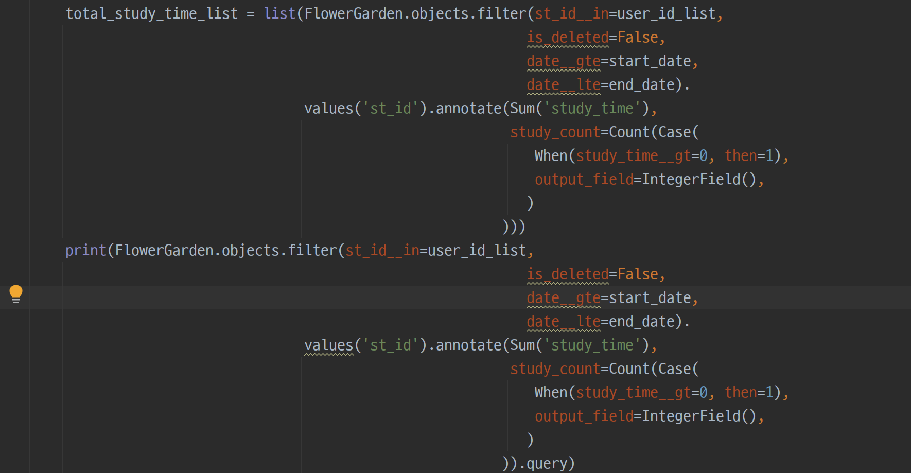 초반에 쿼리를 잘못짠게 아닐까?라는 생각에 API를 하나하나 뜯어보면서 어디가 느린지 디버깅해보았다. django에서는 queryset이라는 객체 기반의 함수를 사용해 쿼리를 만들고, 실제로 데이터를 호출할 때 쿼리가 실행된다. 따라서 코드상에서는 쿼리를 알 수가 없지만, print(queryset.query)를 통해 어떤 쿼리가 실제로 실행되는지 알 수 있다.
