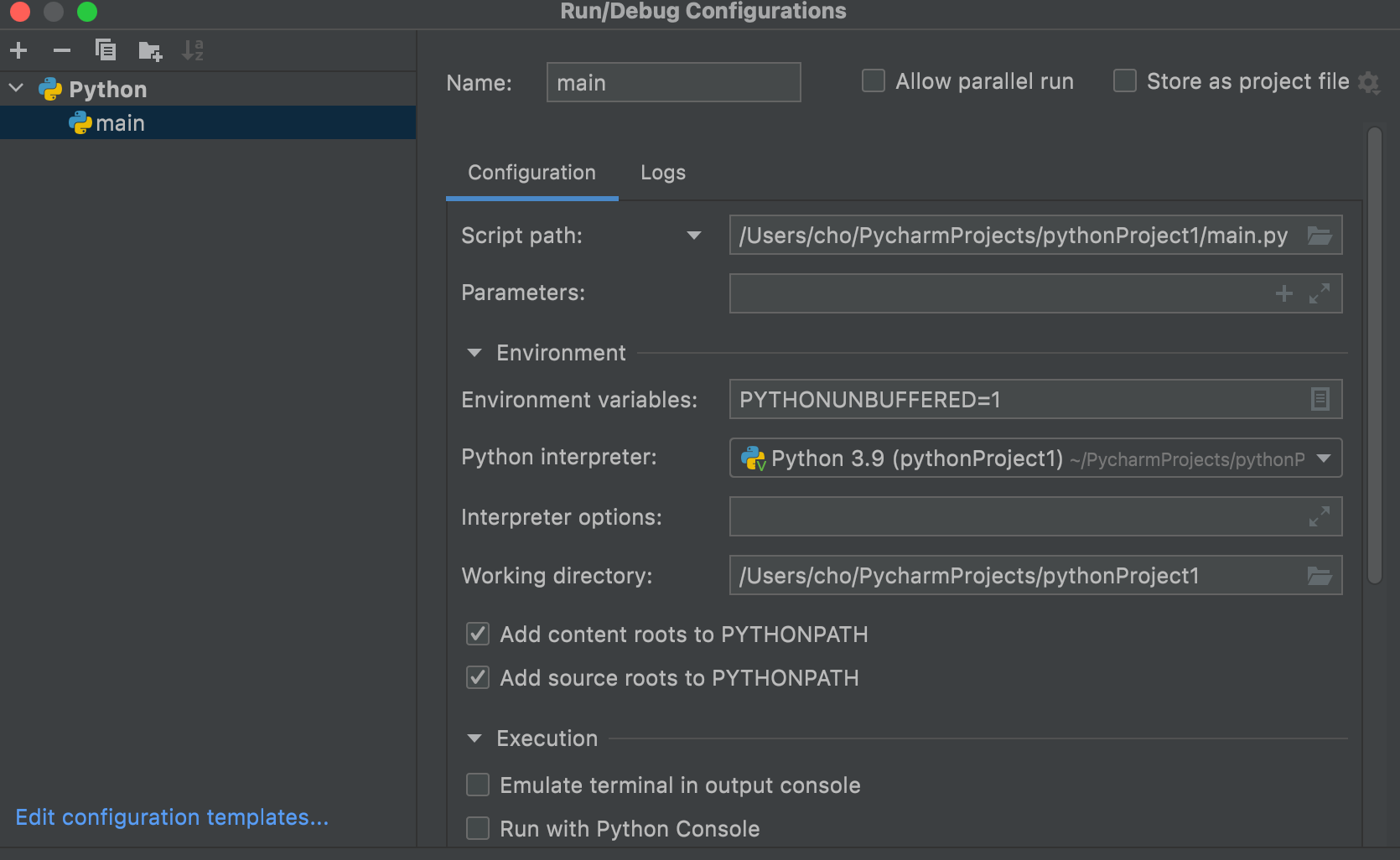 pure python 프로젝트로 만들게 되면 main.py를 실행하도록 되어있는데 이걸 manage.py runserver를 실행하도록 변경합니다.