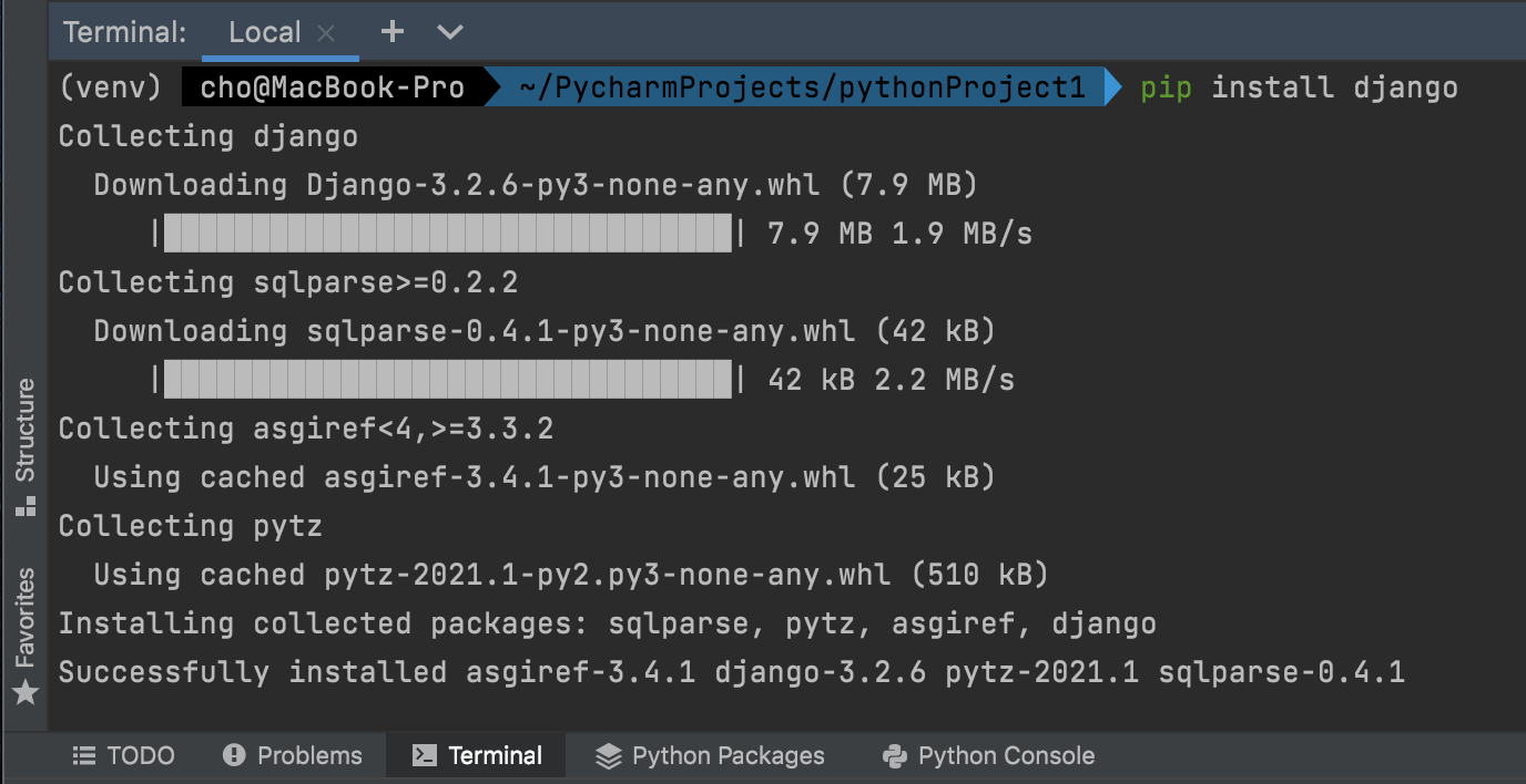 여기서 이제 django를 설치해야합니다. Pycharm 아래 Terminal이라는 하단 메뉴가 있는데 선택하면 터미널 창이 열립니다.