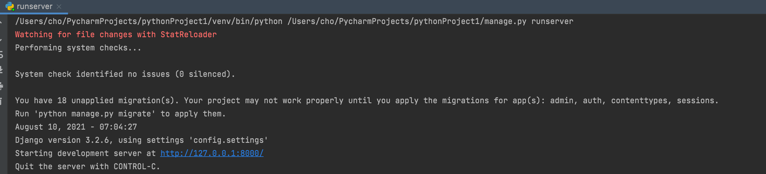자 이제 Run (오른쪽 위에 재생 아이콘)을 누르면 django가 실행됩니다.