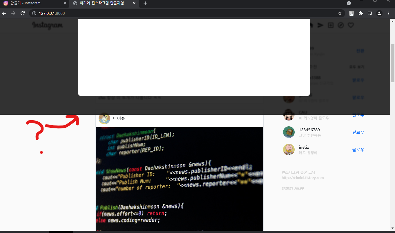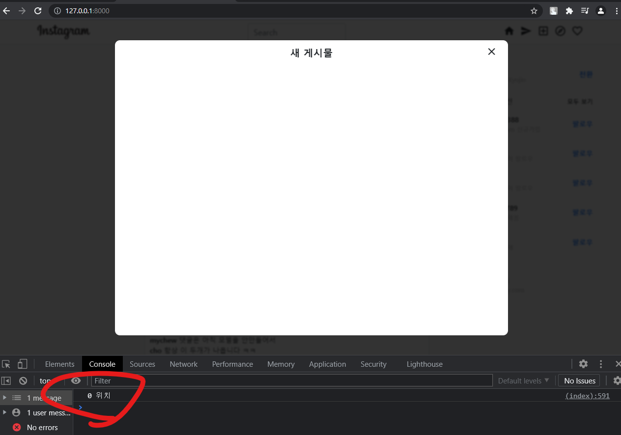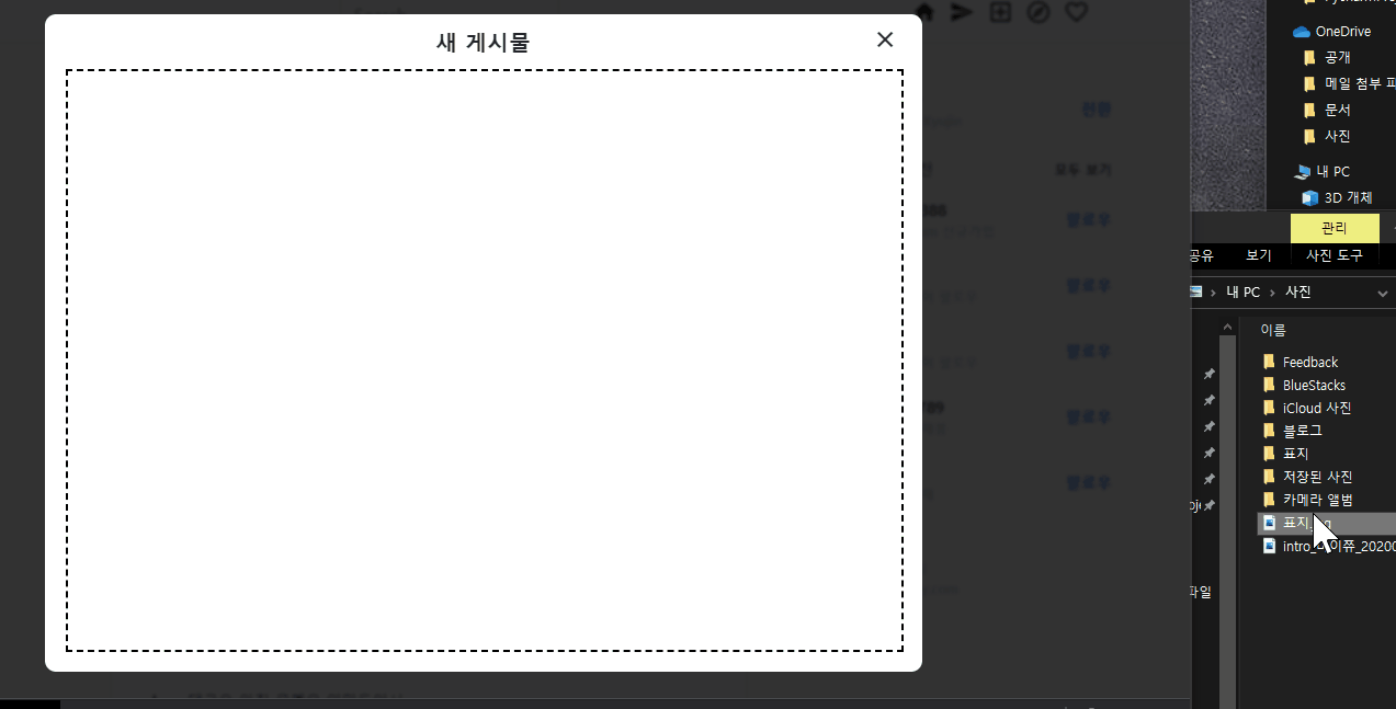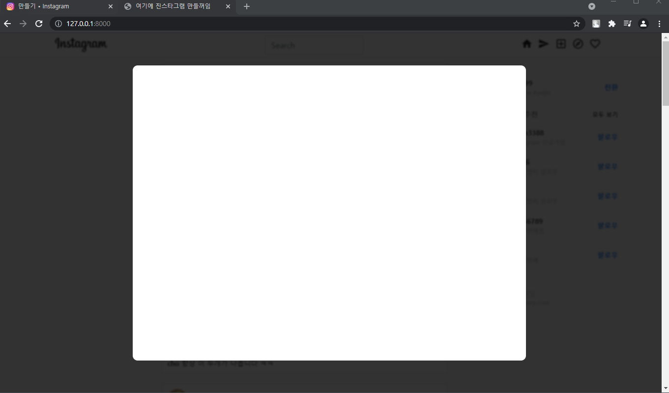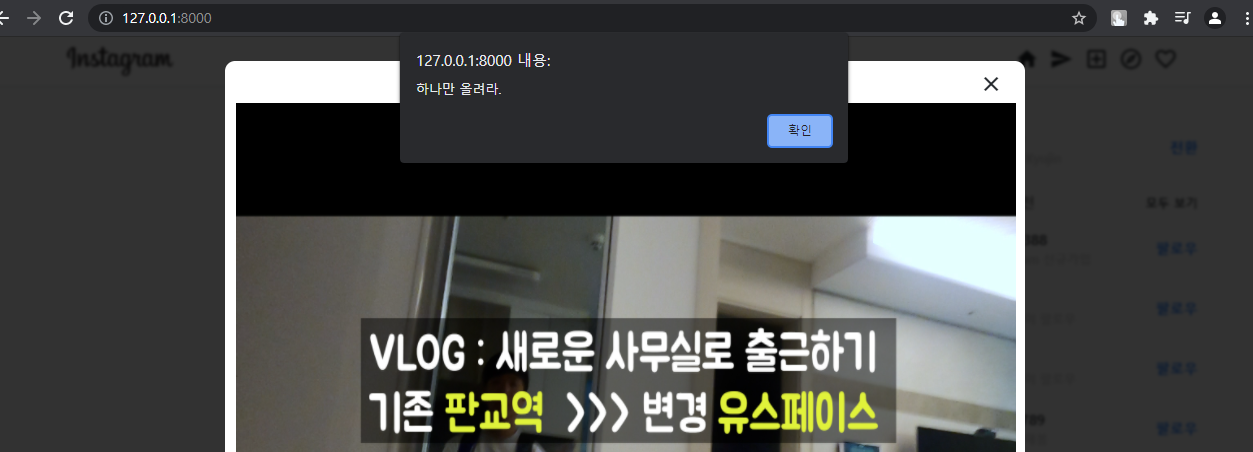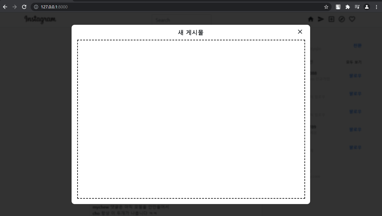음 그럼 일단 피드 업로드를 눌렀을 때, 사진을 업로드할 수 있는 창을 뜨게 만들면 됩니다. 여기서 한 가지 고민 포인트가 있는데, 인스타처럼 피드 생성을 눌렀을 때 기존 화면 위에 새로운 창이 뜨는 기능 - 팝업 또는 모달 - 을 개발하기 위해서는 자바스크립트를 사용해야 합니다. 근데 파이썬과 장고를 사용한 클론 코딩에서 굳이 자바스크립트까지 배워야 할까?라는 생각이 들었습니다. 근데 만약 안 쓰면 UI/UX가 조금 후져지긴 합니다. 만약 프론트 개발이 목적이라면 자바스크립트까지 확실히 하는 게 좋긴 한데,,