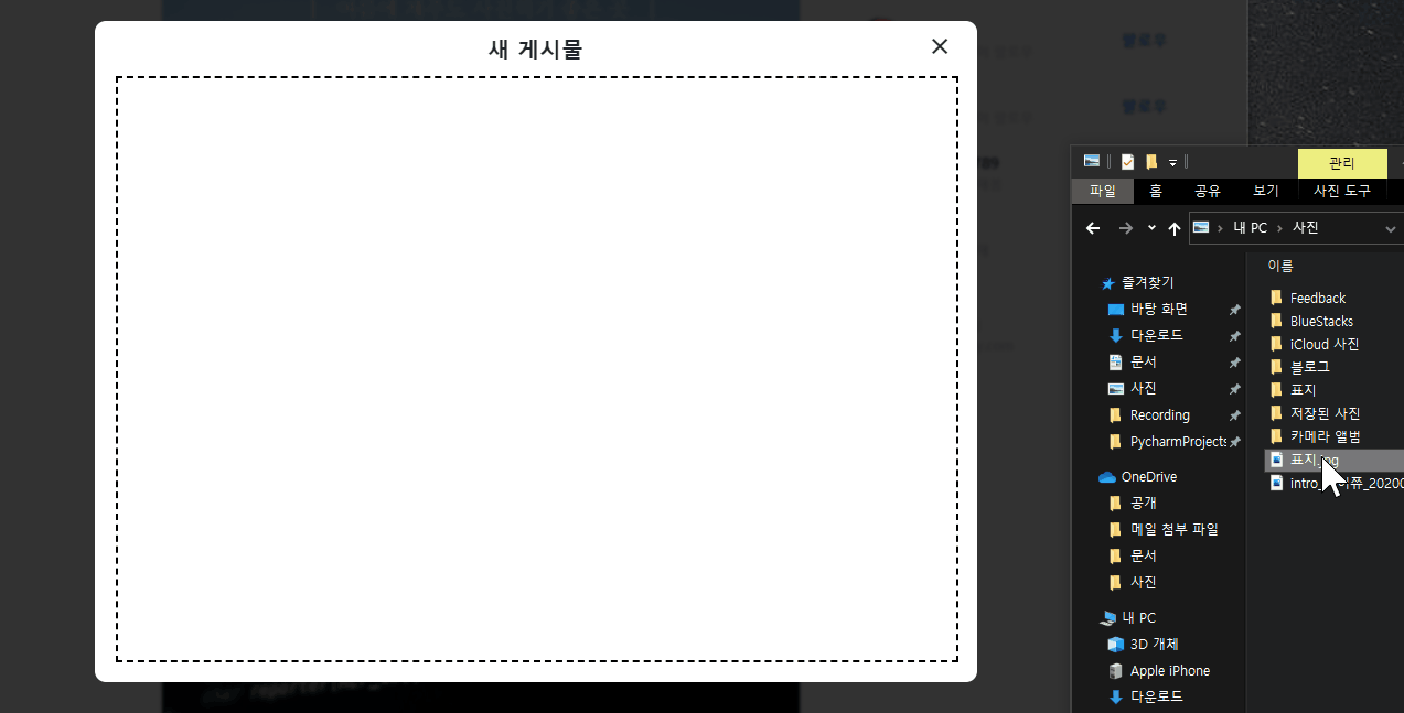 만든 모달 창 타이틀 아래 공간을 파일을 업로드할 수 있는 공간으로 바꿔봅시다.
