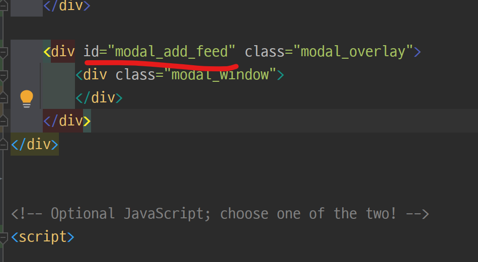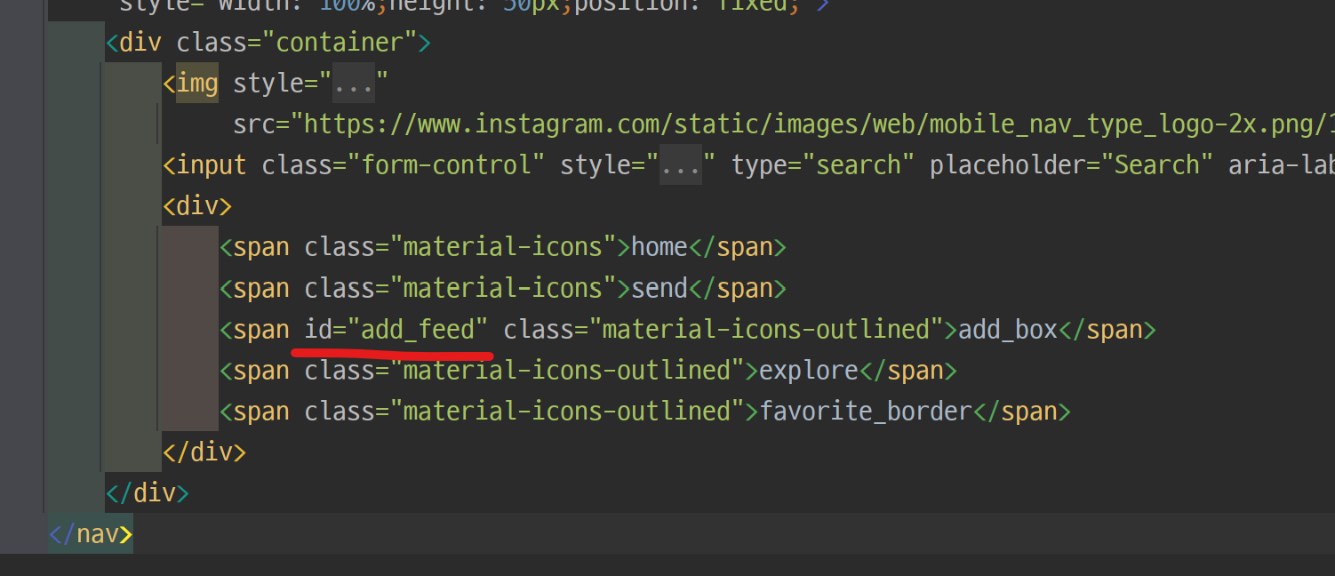 id를 넣어주는 이유는 자바스크립트에서 해당 아이콘을 찾을 수 있도록 해주기 위해서입니다. 자바스크립트에서 이제 add_feed라는 id를 가진 아이콘을 누르면 모달이 나타나도록 코딩할 수 있습니다. modal이 나타나고 사라지고도 제어하기 위해서는 modal에도 id값을 추가해야 합니다.