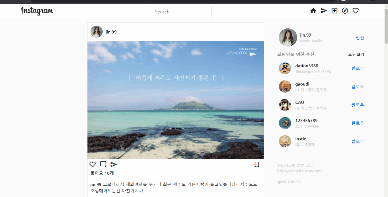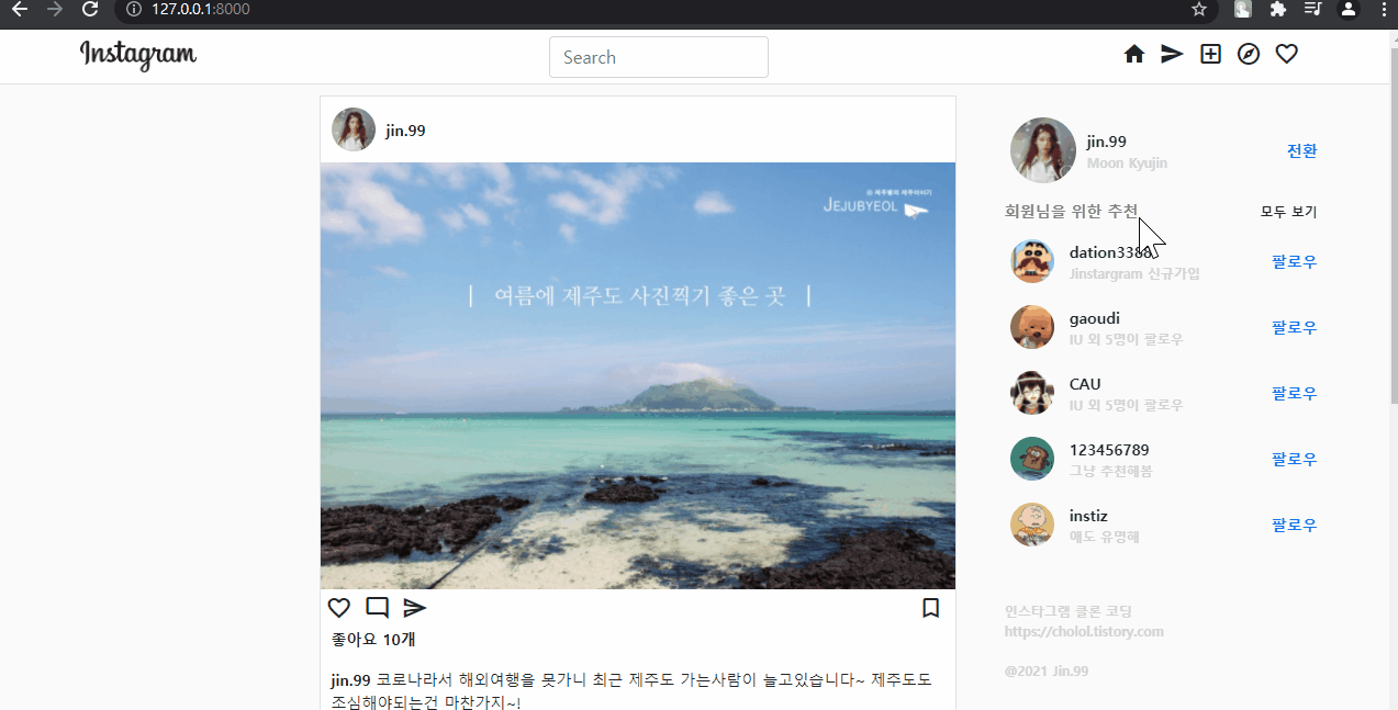 | Django:제로부터 시작하는 인스타그램 만들기 - clone instagram #3 (6) | 2021.09.15 |