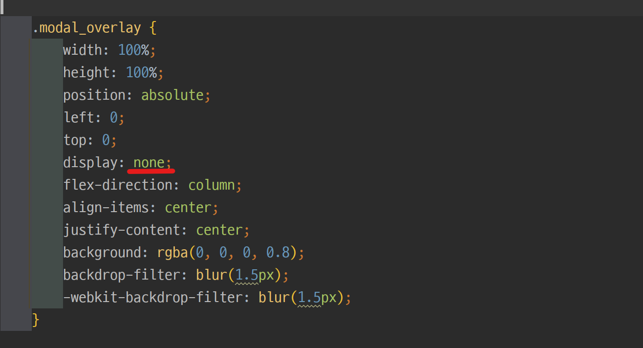 근데 modal css를 보면 지금도 flex로 되어있습니다. flex로 되어있는 것을 flex로 바꾸면 의미가 없기 때문에 기존에 css를 none으로 바꿔줍니다. none으로 바꾸면 화면에서 보이지 않습니다.