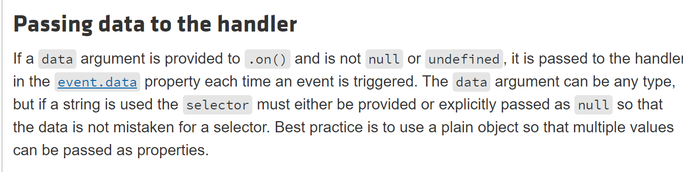 요런 게 나와있는데요, 대충 on안에 함수를 호출할 때 아무것도 안 넣으면 event.data를 전달한다는 내용입니다.