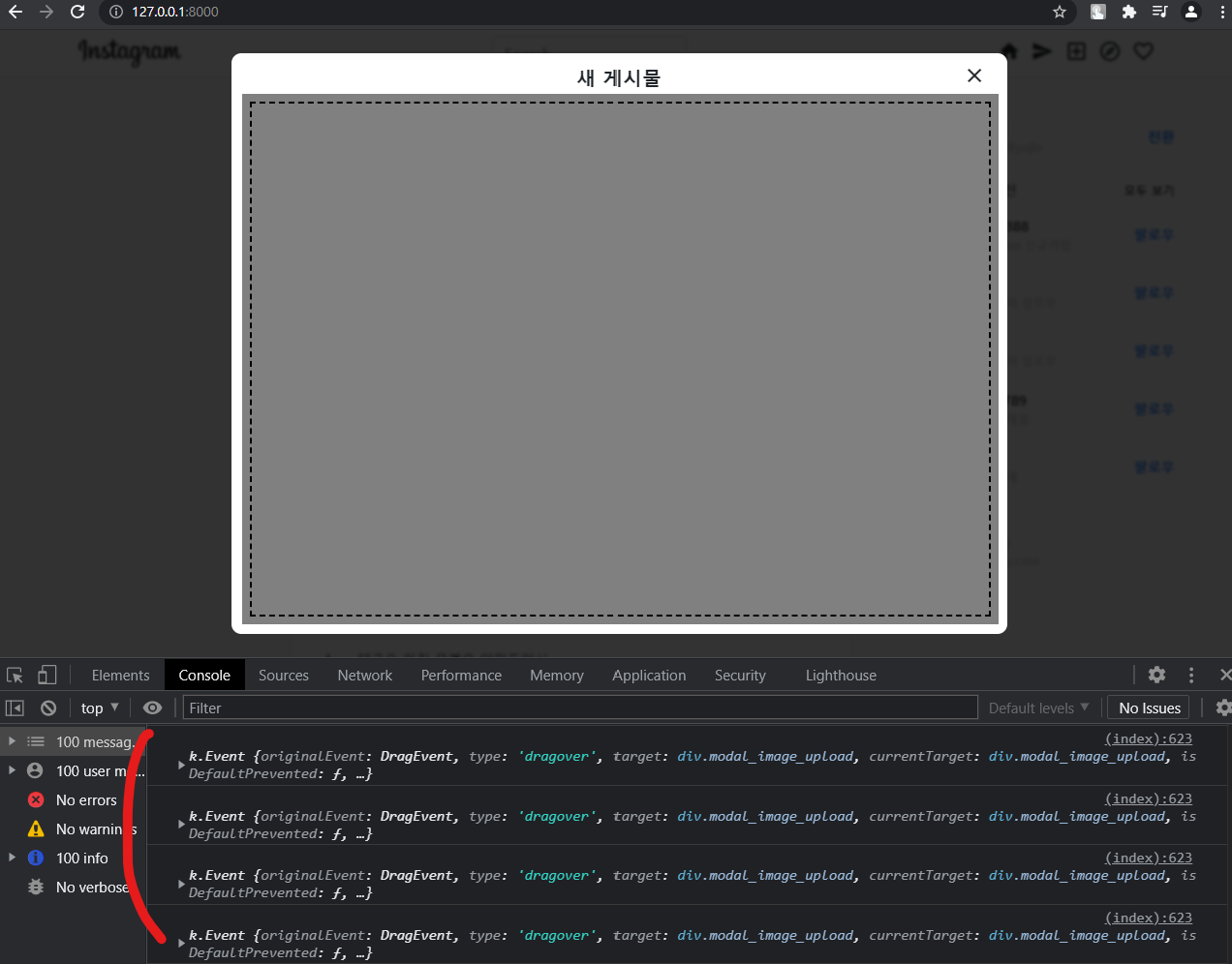 아무 이미지 파일이나 한번 드래그해서 올려보세요. 로그가 막 올라오는 것을 확인할 수 있습니다. 로그 찍힌 거를 보면 무슨 이벤트에 대한 정보가 들어있는 것 같아요. 여기서 target을 보면 div.modal_image_upload를 가리키고 있습니다. 우리가 만든 div를 말하네요.