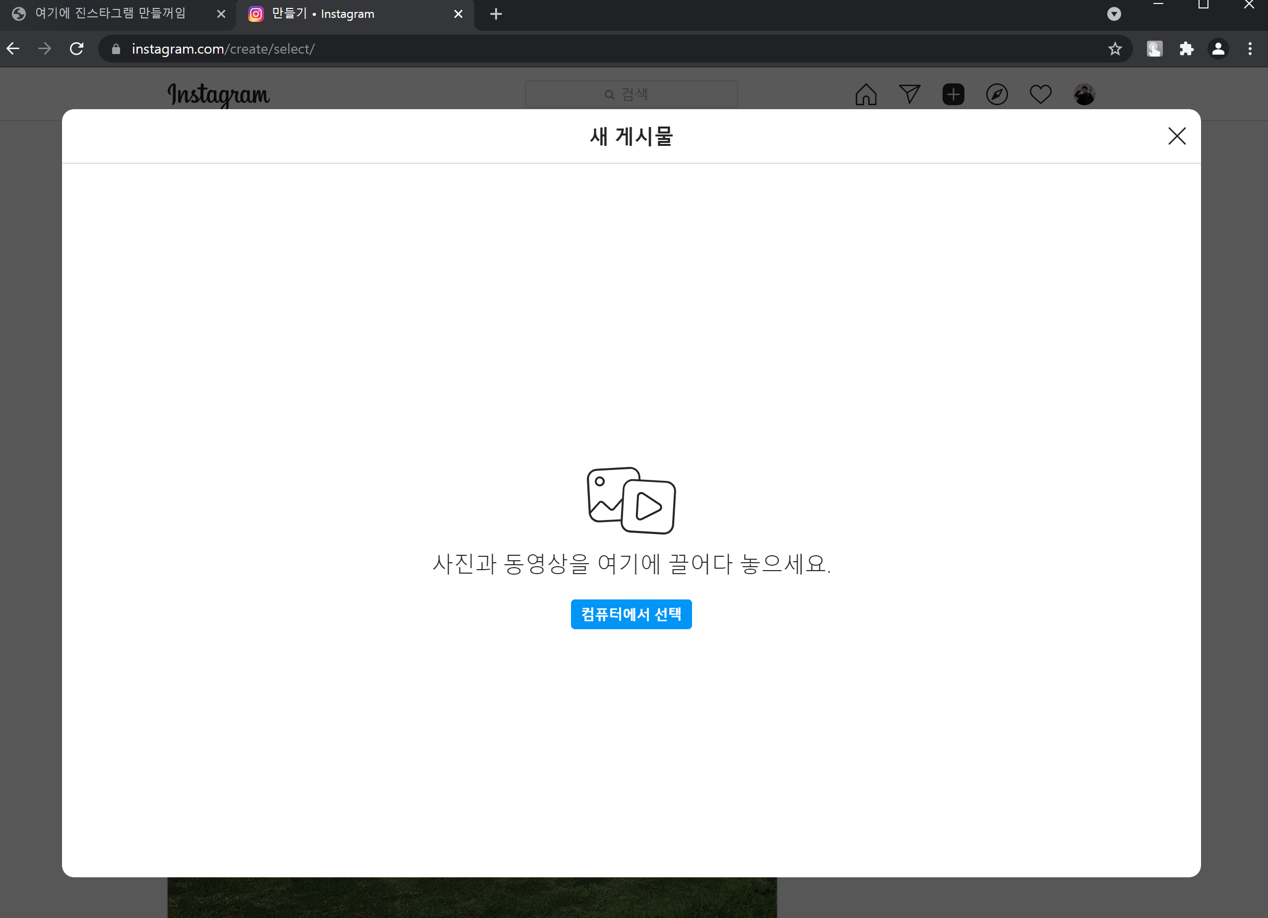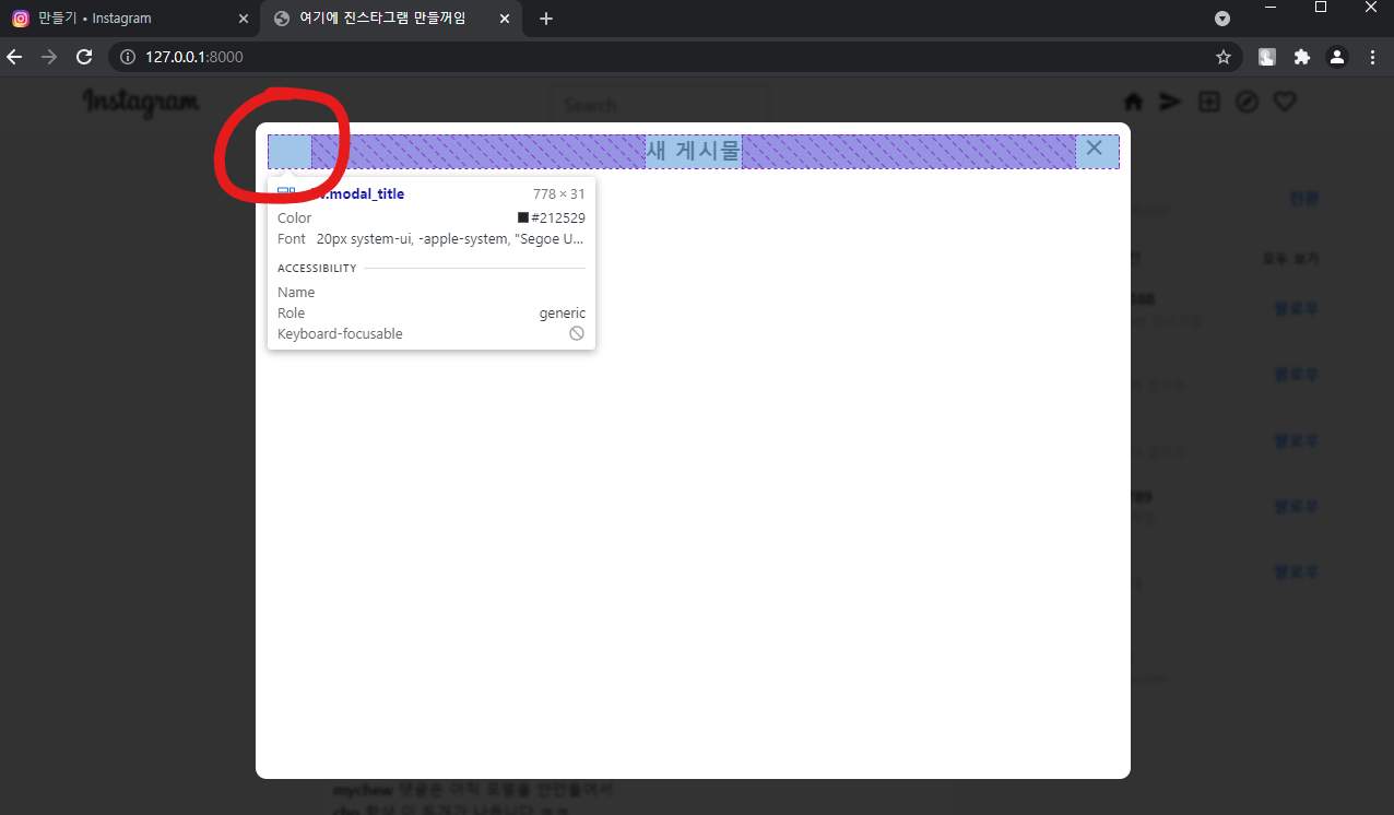 다시 한번 인스타그램에서 피드 생성을 눌러보면 생성을 눌러 모달 창이 뜨고, 스크롤이 없어지는 것을 볼 수 있습니다. 우리도 해봅시다 ㅎㅎ