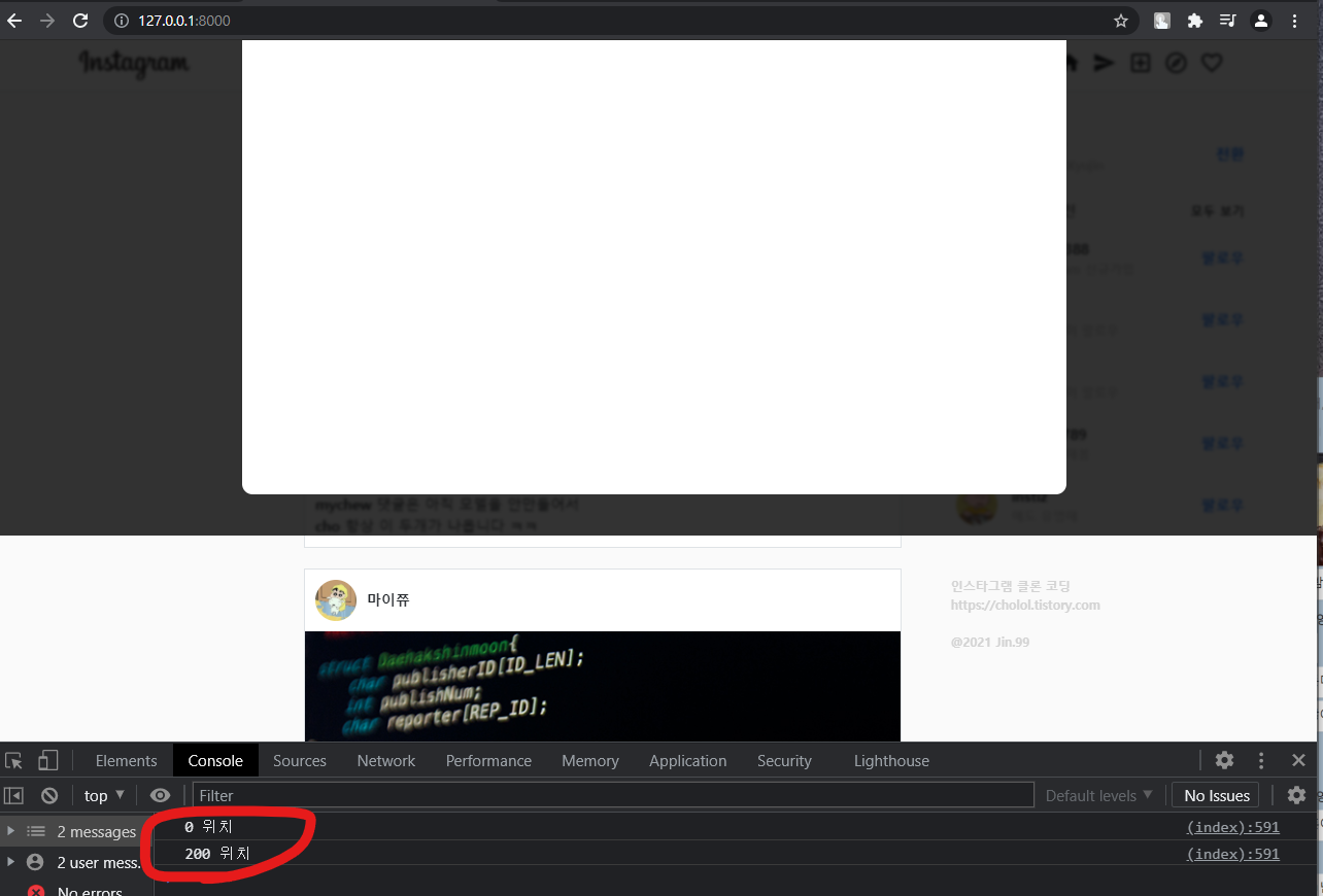 콘솔에 "0 위치"라고 찍혔습니다. 스크롤을 움직이지 않았기 때문에 위치가 0입니다. 그럼 스크롤을 약간 내려서 다시 해볼까요?