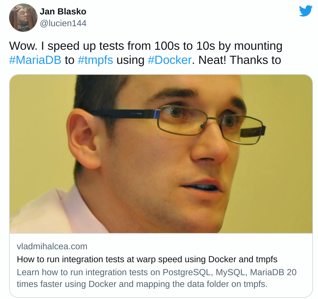 --tmpfs /var/lib/mysql:rw 이 마법의 옵션을 주면 속도가 대폭 향상.