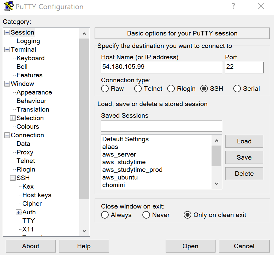 서버가 정상적으로 Running 상태가 되면 putty로 접속을 해봅시다. Open을 누르면 접속!