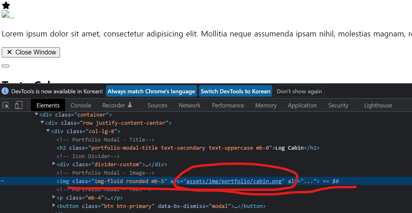 이건 우리가 static을 경로로 잡아주었지만, 실제 index.html에서의 경로를 잡아주지 않았기 때문입니다. 개발자 모드로 이미지가 깨진 곳을 클릭해보면...