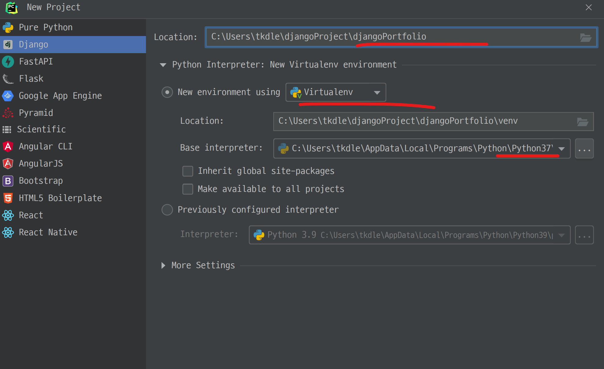 저는 파이참 프로버전을 사용하기 때문에 바로 장고 프로젝트를 만들 수 있습니다. 파이썬 버전은 3 버전대를 아무거나 사용하시면 됩니다. 저는 3.7로 생성