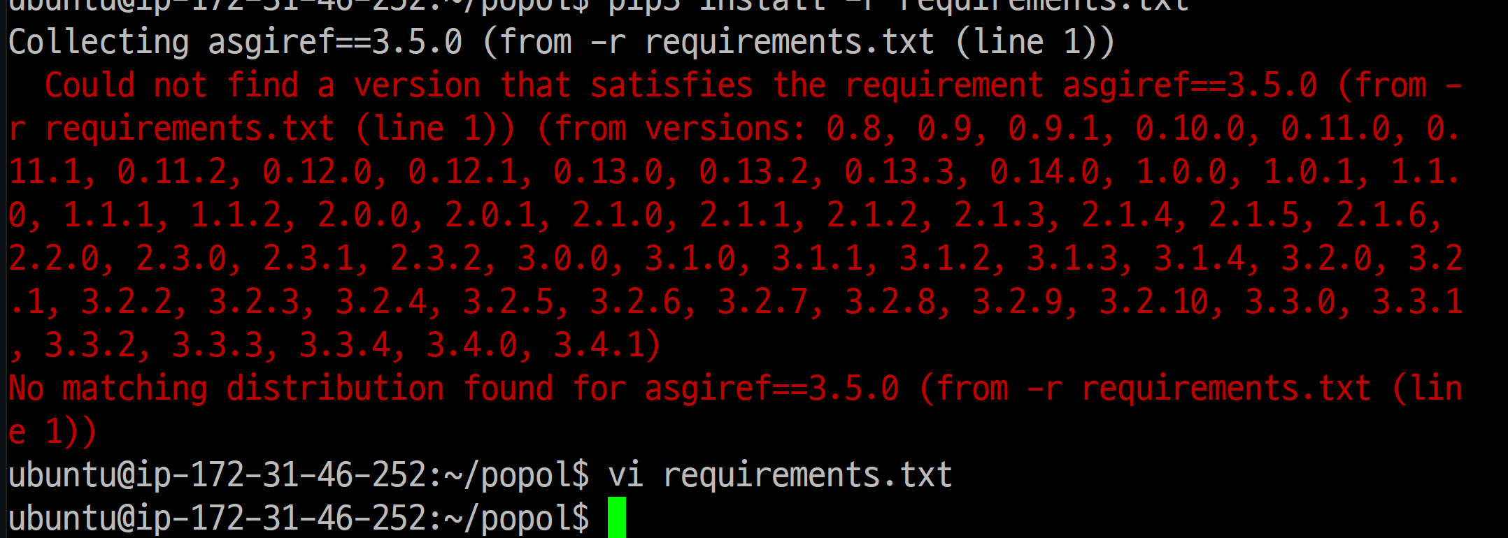에러가 또 나네요. asgiref 3.5 버전을 찾을 수 없다고 합니다. 저희가 로컬에서 만들 때 python 3.7을 쓴 거 같은데 서버에는 3.6.9가 기본으로 설치되어 있네요. ㅂㄷㅂㄷ,,, 그럼 requirements.txt를 조금 고쳐줍니다.