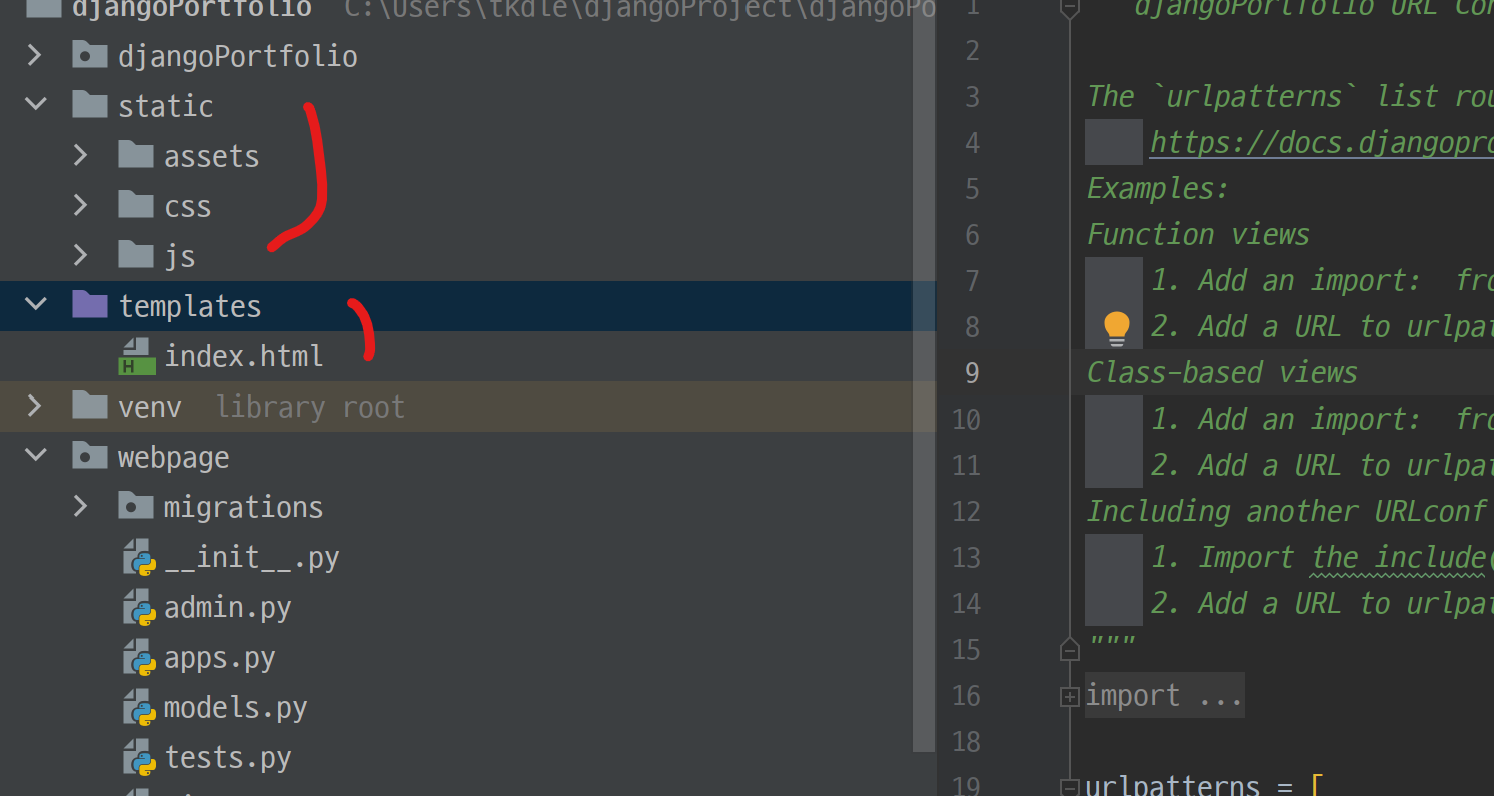 자 이제 우리가 다운받았던 템플릿을 장고 프로젝트에 복사해야 합니다. 두 분류로 나누어서 저장을 해야 하는데, html 파일은 templates폴더에 넣고, 나머지 cs, jss, asset은 static이라는 폴더에 넣습니다. templates 폴더는 파이참이 알아서 만들어줬는데, 없으면 만드시면 되고, static폴더도 만들어줍니다.