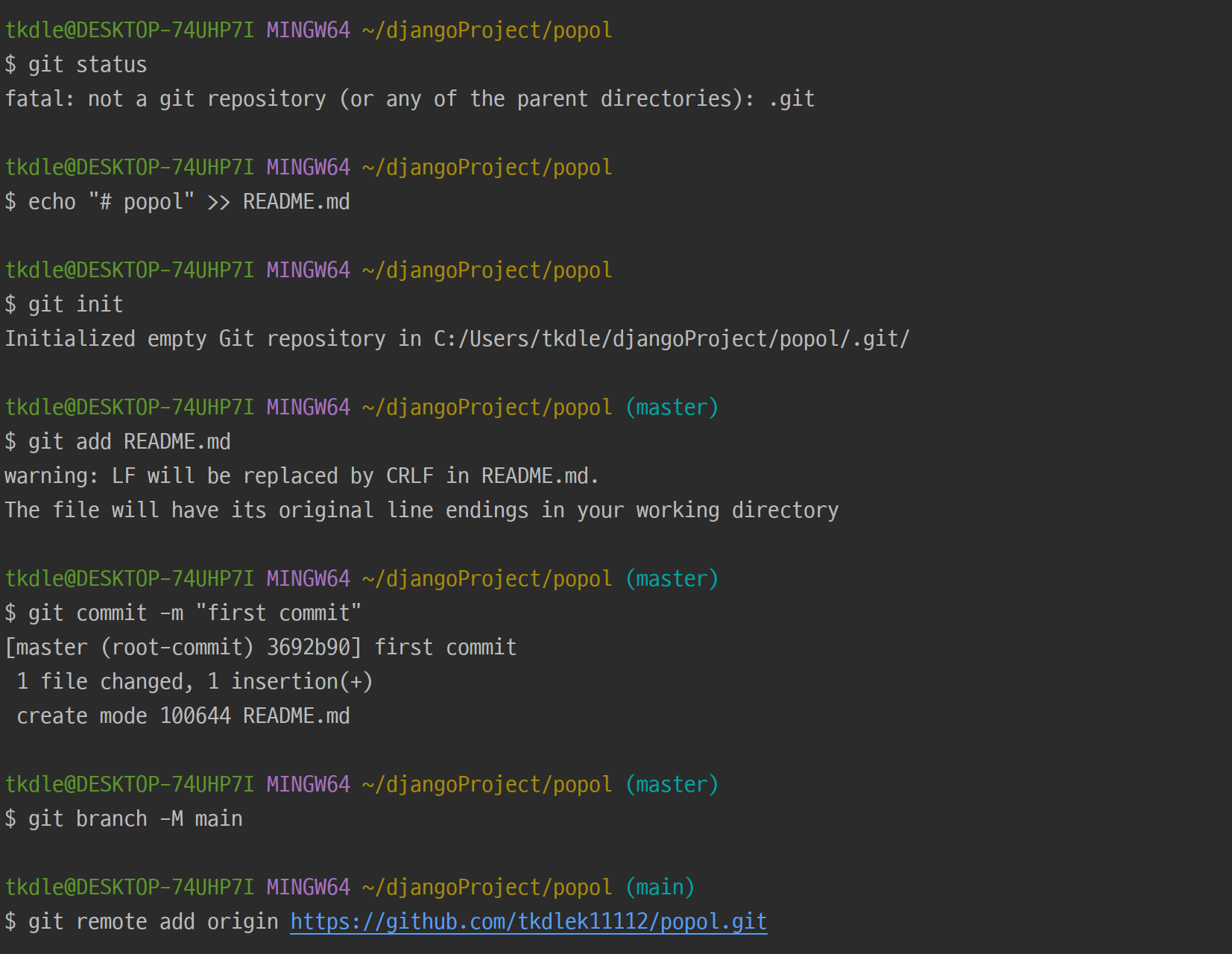 이제 venv를 뺏으니 나머지 전부 git add . 해주고 git commit, git push를 해줍니다. (깃 사용법은 다들 아실 거라고 생각하고...)