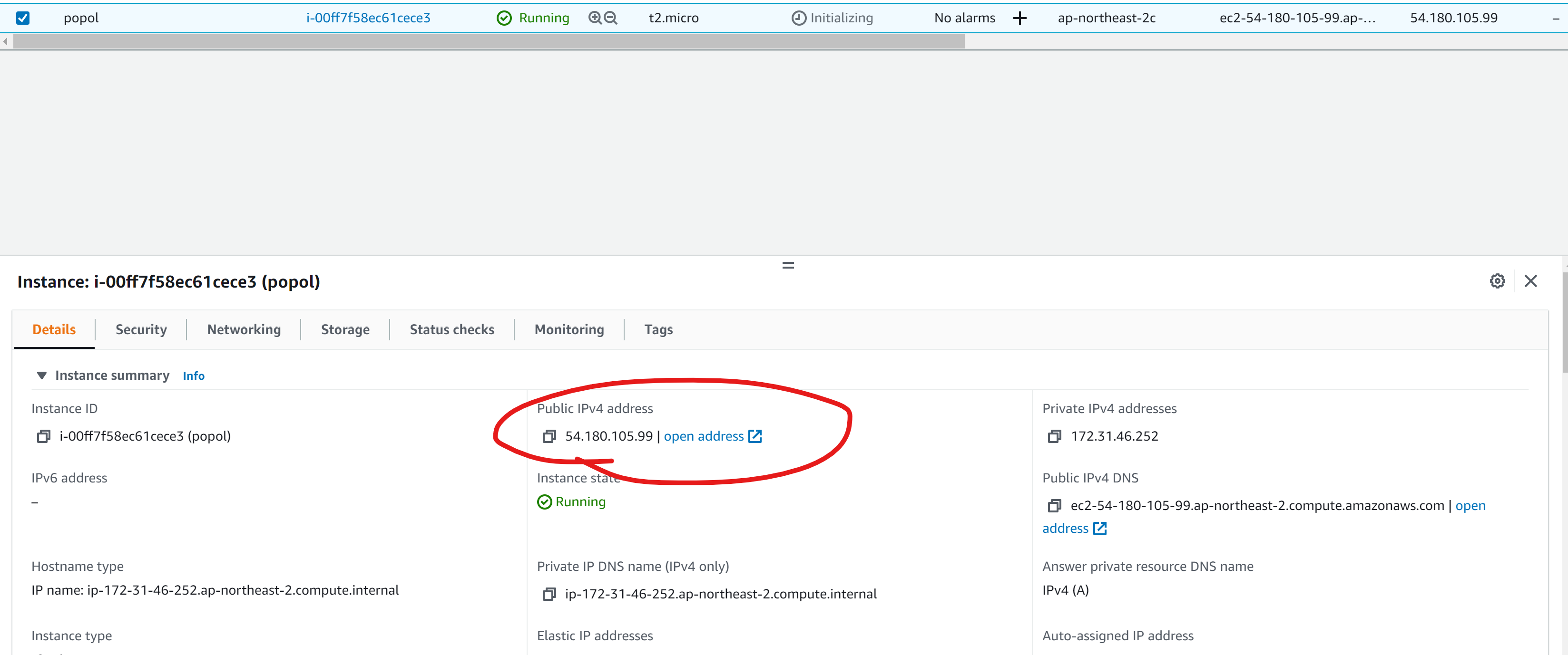 새 인스턴스가 열심히 실행 중인 게 보입니다. 요걸 선택하면 세부 정보가 나옵니다.