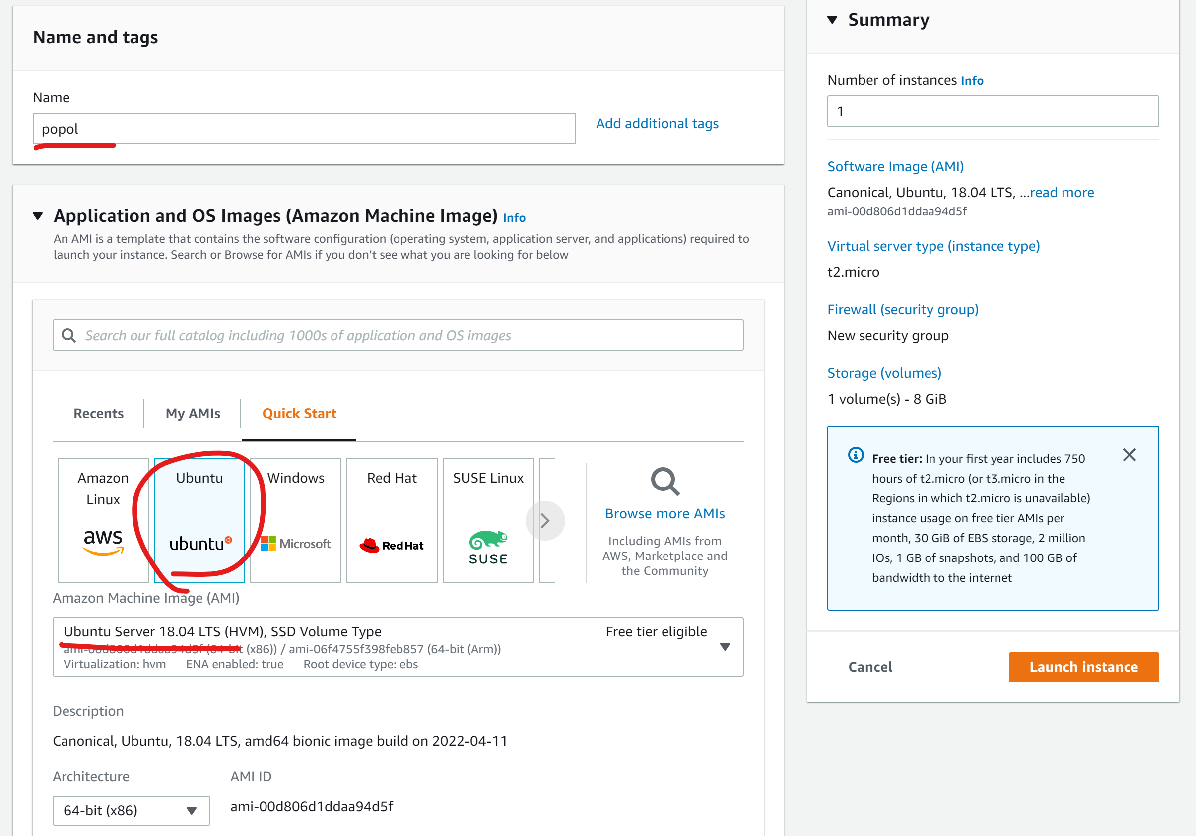 이름은 뭐 아무렇게나 지어주시면 됩니다. OS는 ubuntu를 사용할 건데 18 버전을 사용할 예정입니다. 최근에 22버전까지 나왔네요? 근데 20버전부터 mysql 8.0을 써야해서 mysql5.7을 못씁니다. 아마 많은 회사들이 5.7을 쓰고있어서 ubuntu 18버전을 쓰고 있을 것 같은데 말이죱. 여기서는 db를 안 쓰기는 하는데 그냥 18 버전이 편하니까 18 버전으로 가겠습니다.