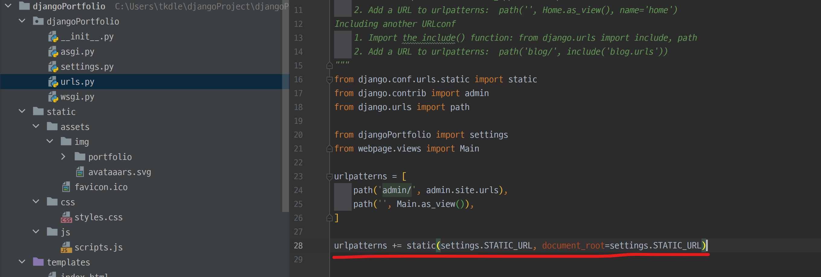 요거를 추가하게되면 static폴더를 url경로로 접근할 수 있게 해 줍니다. 즉 static/assets/img/avataaars.svg 파일을 127.0.0.1:8000/static/assets/img/avataaars.svg로 접근할 수 있다는 것이죠
