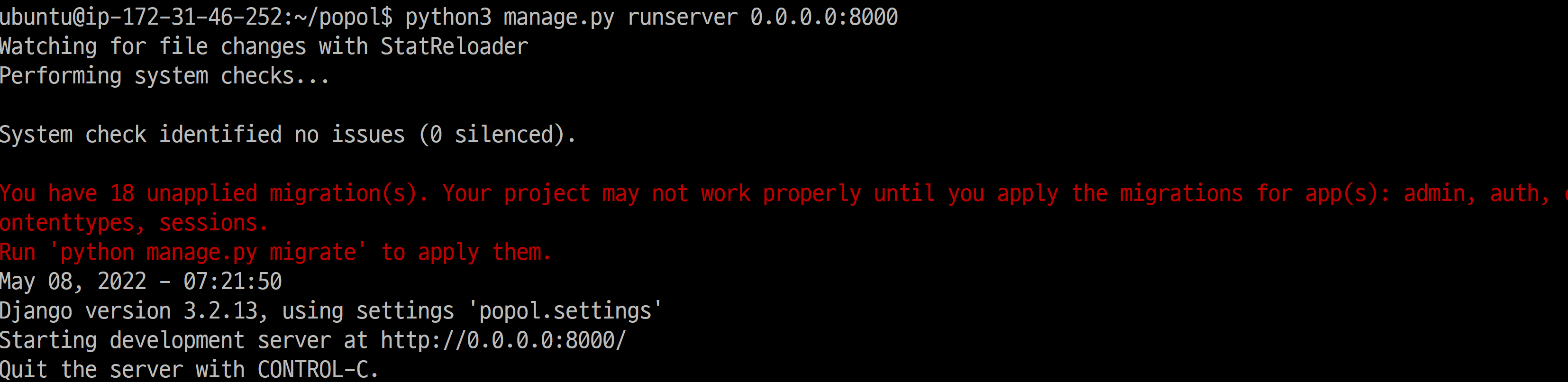 근데 python3 manage.py runserver 0.0.0.0:80을 해주면 권한이 없다고 나옵니다. 80번은 웹 포트이기 때문에 아무나 쉽게 쓸 수 있는 포트가 아니죵. 하지만 간단하게 sudo 권한으로 실행하면 실행이 됩니다. 앞에 sudo만 붙여주세요