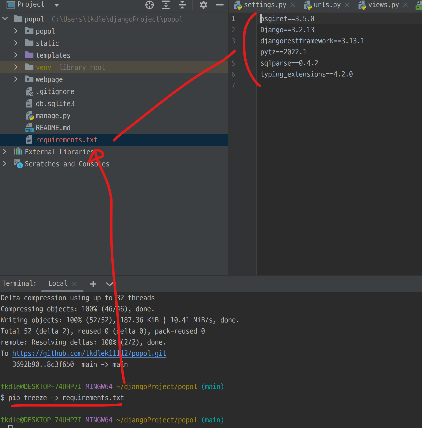 아항 requirement.txt를 만들어주지 않았네요. 설치된 패키지 정보를 txt로 만들어줘야 배포 시 편합니다. 다시 파이참으로 돌아가서 pip freeze -> requirements.txt를 해줍니다.