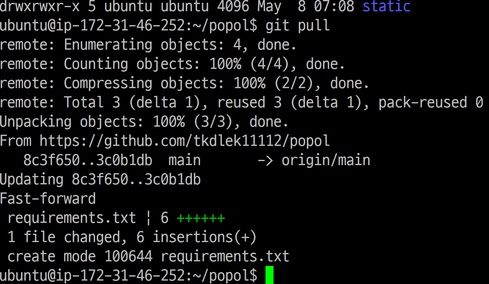 ec2에서는 git pull을 해서 새로 추가된 파일을 받아줍니다.