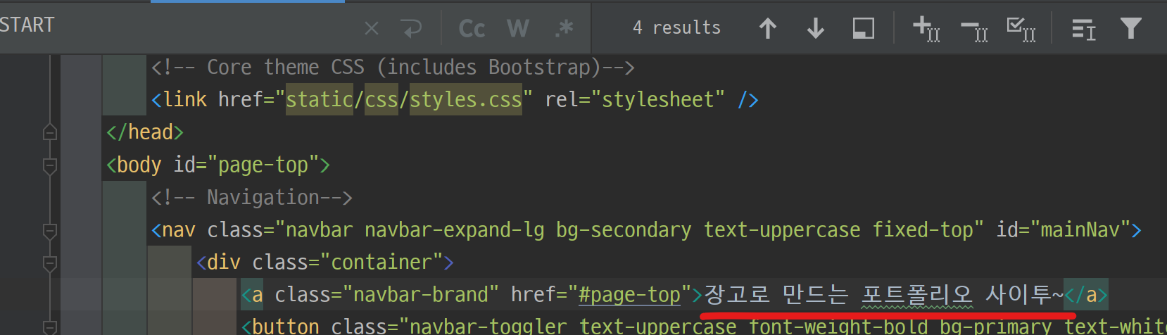 일단 상단에 START BOOTSTRAP이라는 거 바꾸고 싶으면 index.html에서 직접 찾아서 바꾸면 됩니다.