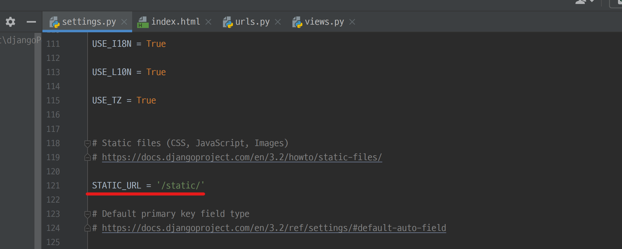 그럼 이제 static폴더를 인식시켜주기 위한 코드를 추가해야 하는데요, 일단 settings.py에 가서 STATIC_URL이란 코드가 있는지 확인합니다.