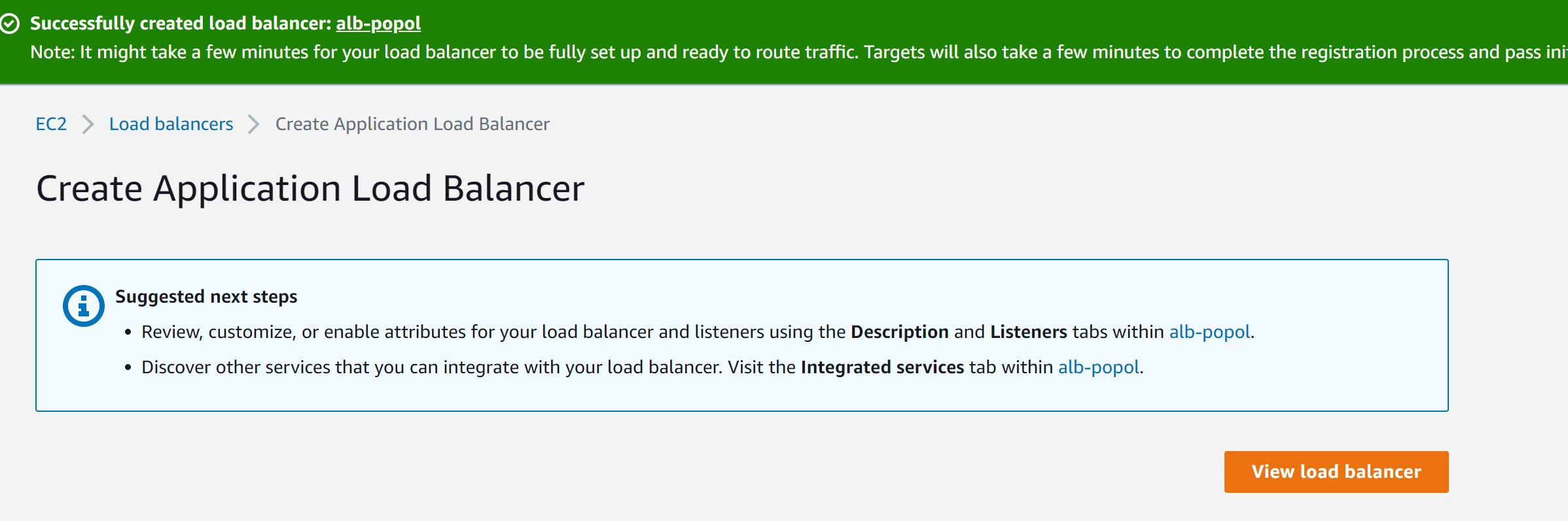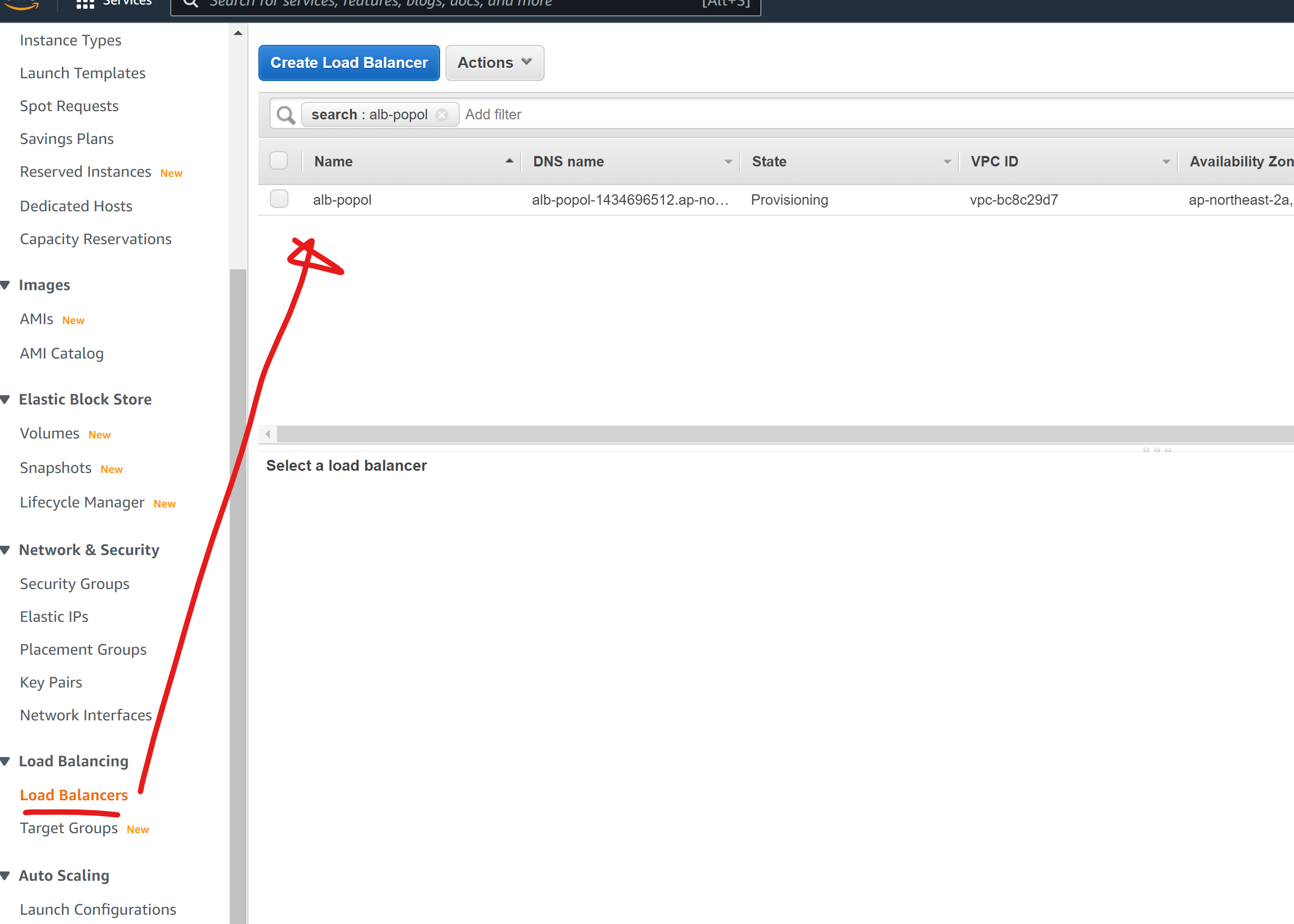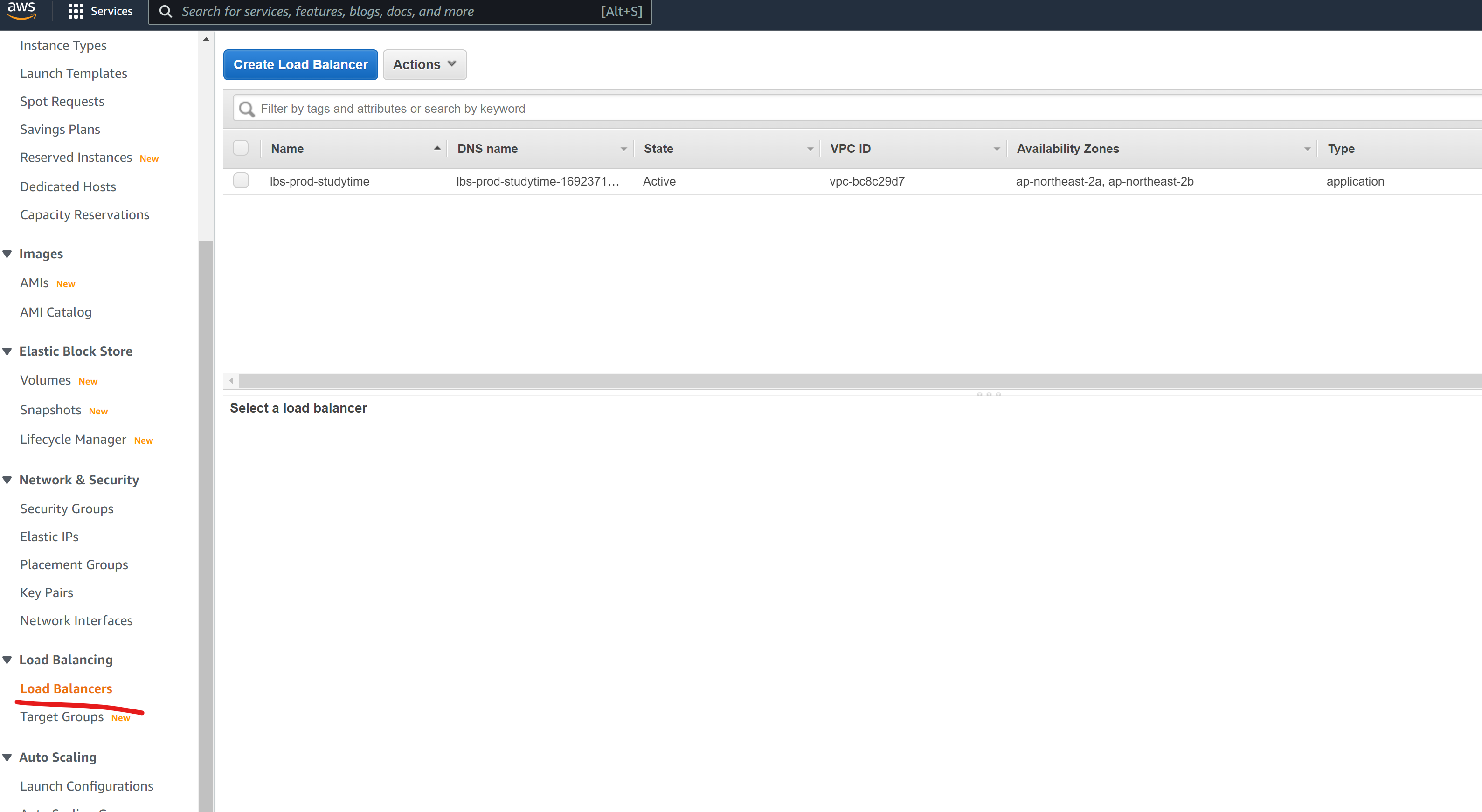 저는 하나를 쓰고 있어서 하나가 나오는데, 여러분은 없겠죠? 여기에 Create Load Balancer 버튼으로 새 로드밸런서를 만듭니다.