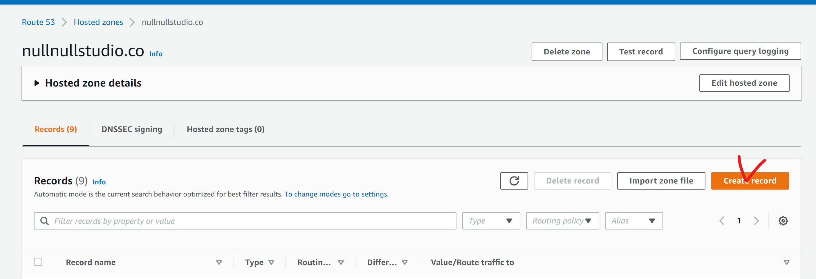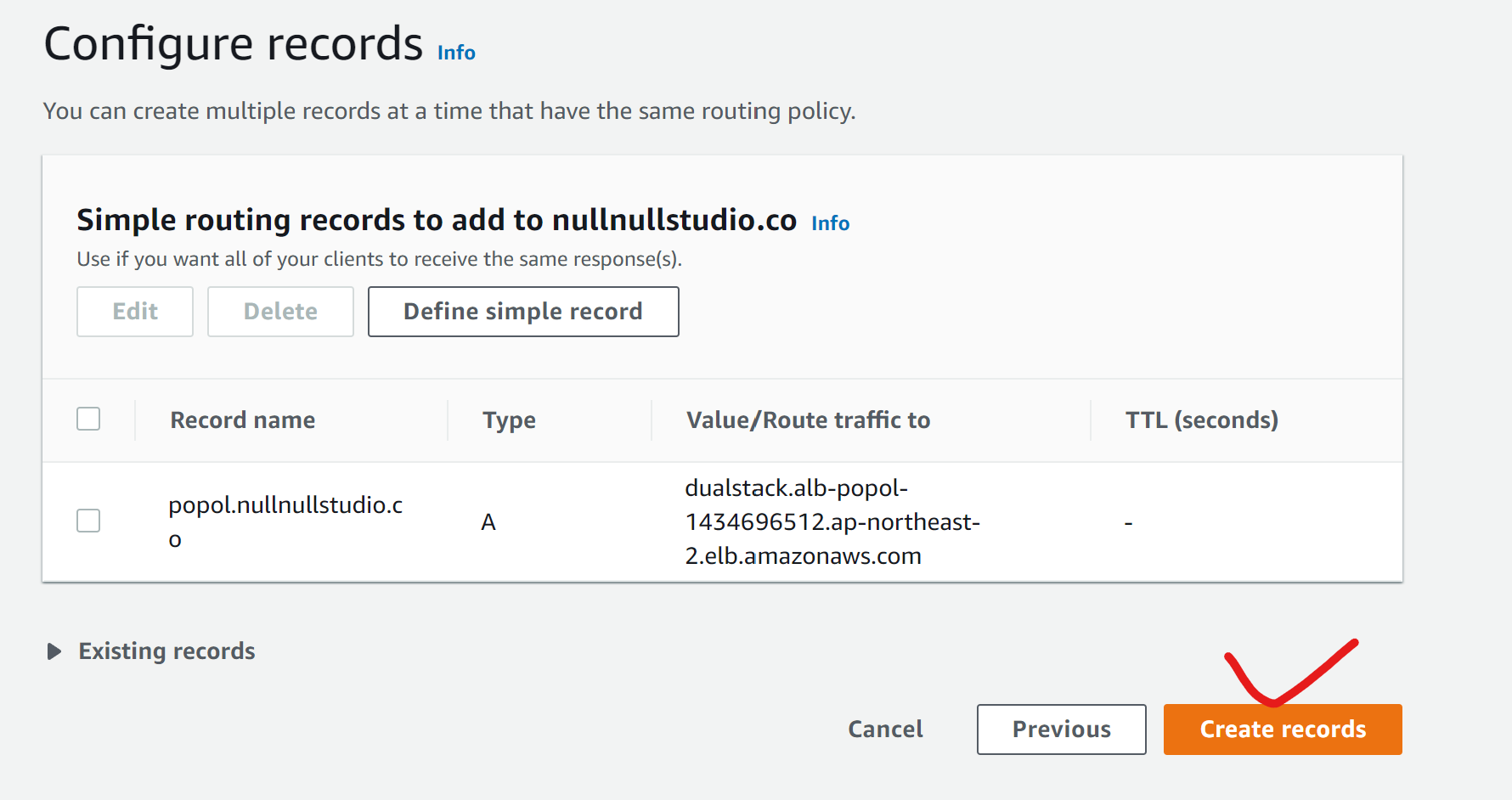 제가 가지고 있는 도메인을 이용해서 서브 도메인을 하나 파서 우리가 아까 만든 로드밸런서와 연결시켜보겠습니다. 도메인 이름을 누르면 서브도메인 설정하는 화면이 나오는데, 여기서 Create record를 누르면 됩니다.