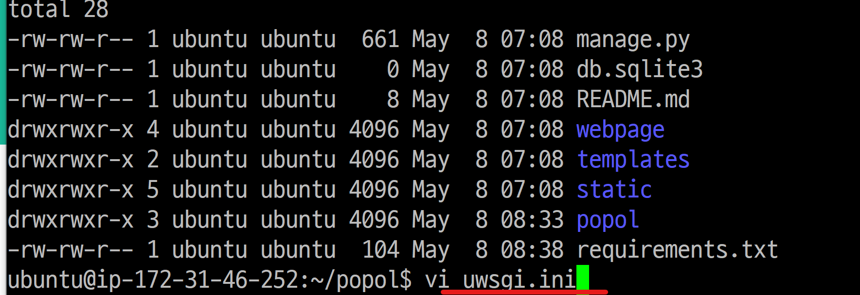 파일을 만드는 것도 vi {파일 이름} 하면 만들어집니다. uwsgi.ini에 다음 내용을 적습니다.
