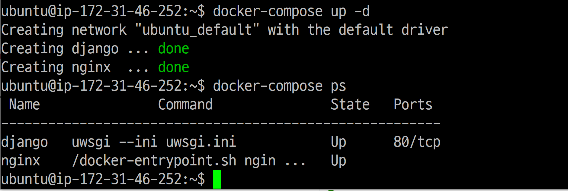 docker-compose ps를 이용하면 현재 떠있는 docker의 상태를 볼 수 있습니다. 둘 다 Up으로 되어있으면 성공!