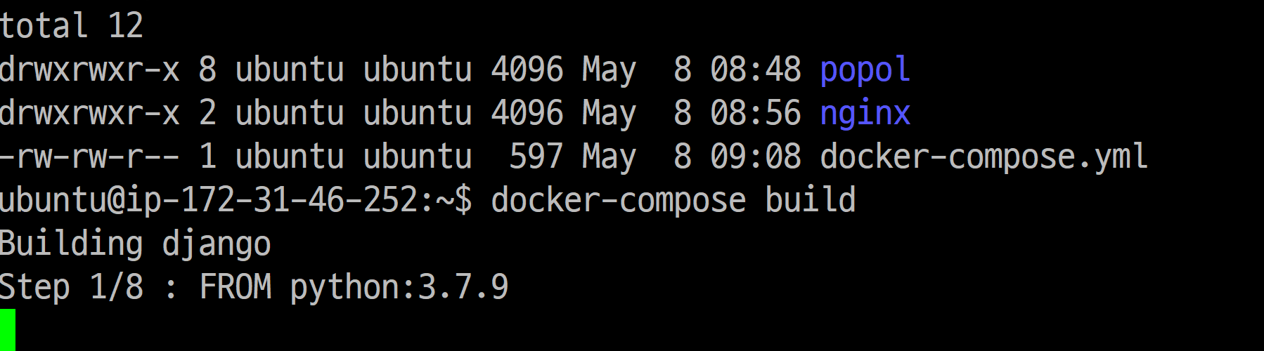 nginx에 파일 3개를 만들었으면 이제 docker-compose파일만 만들면 됩니다. docker-compose는 도커들을 한꺼번에 관리할 수 있는 툴입니다. nginx폴더와 popol폴더 위에 docker-compose.yml파일을 만듭니다.
