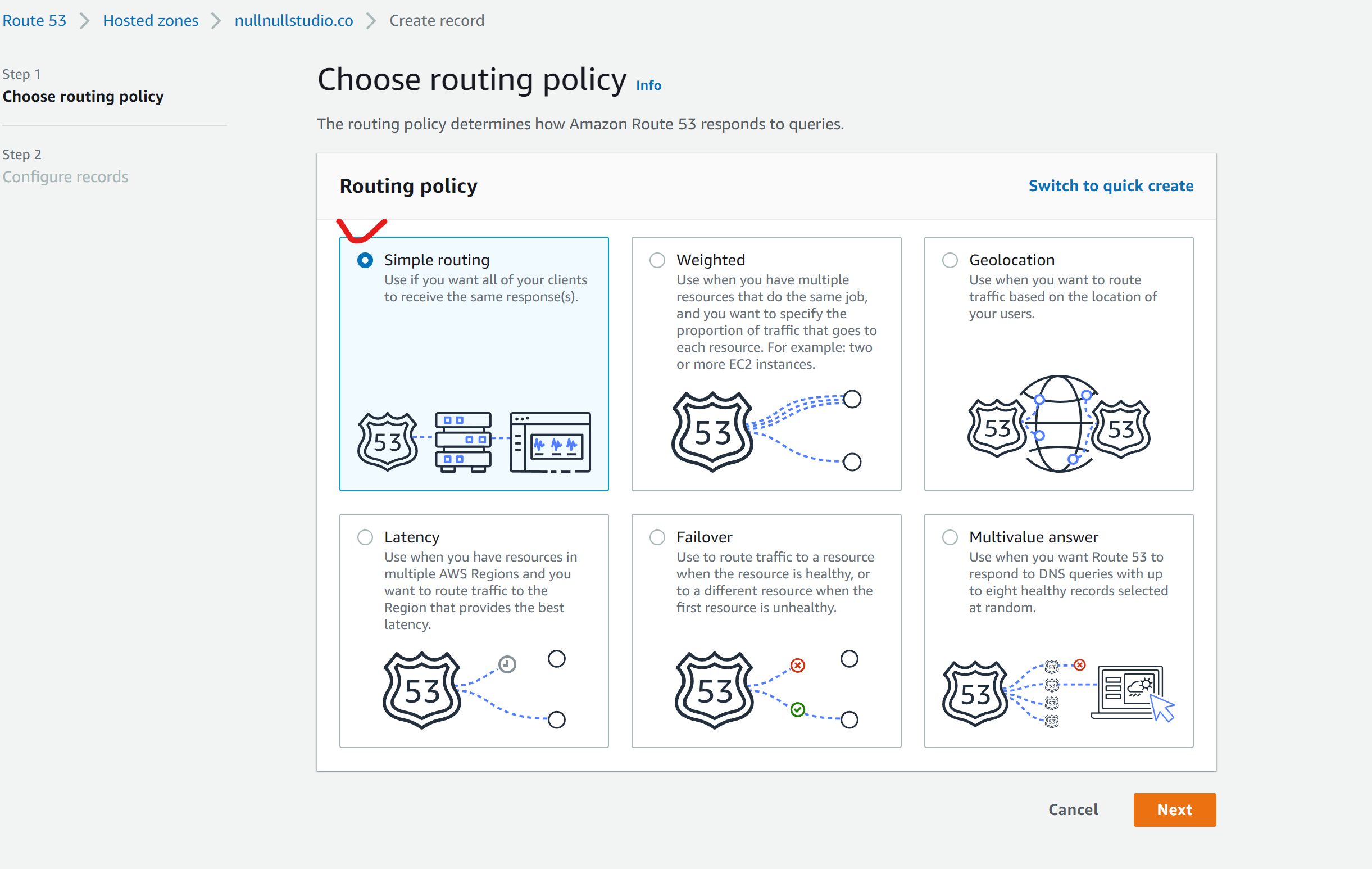 그럼 라우팅 종류를 고르는데, 저희는 심플 라우팅이면 충분합니다.