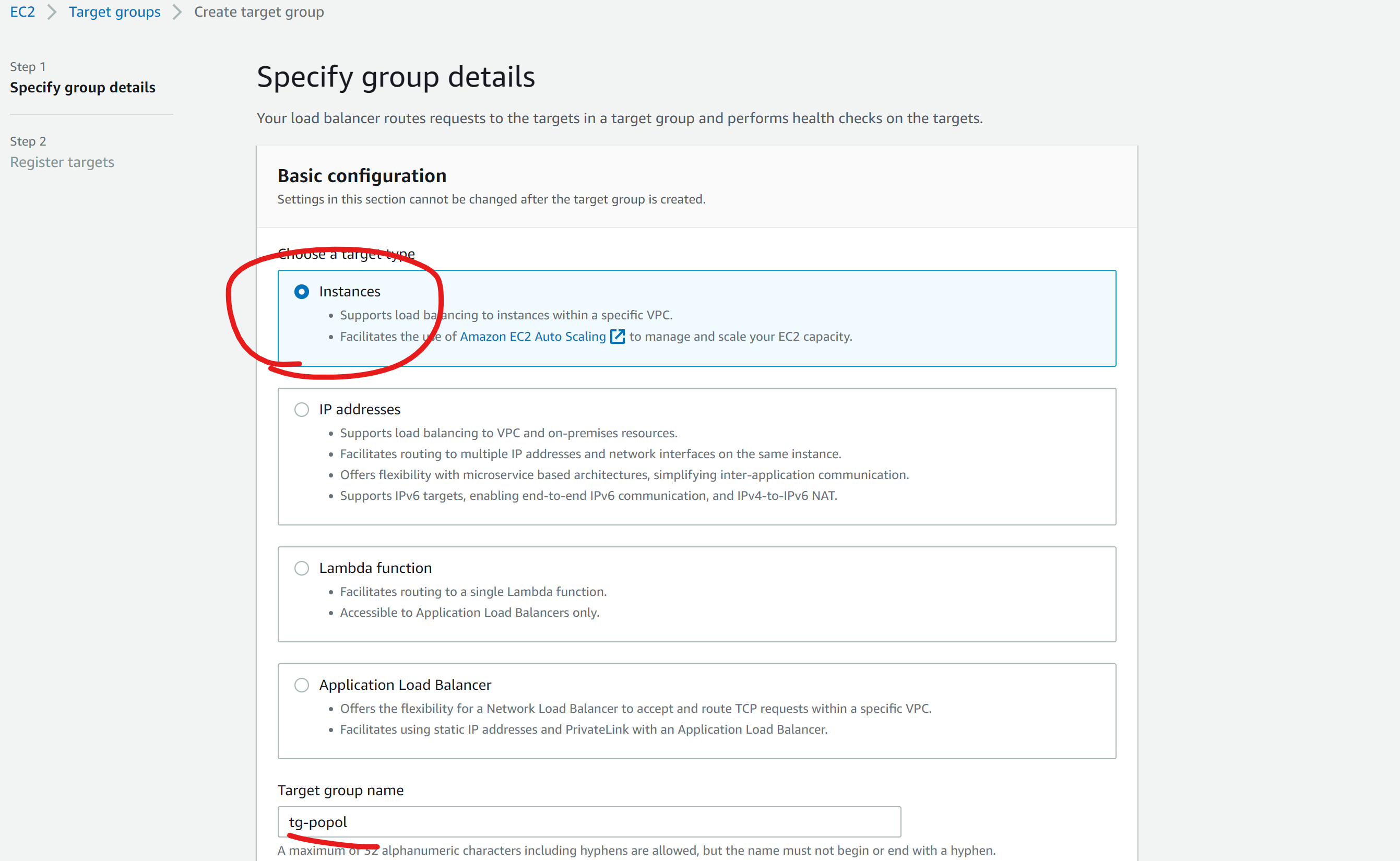 Craete target group으로 하나를 만들어줍니다.