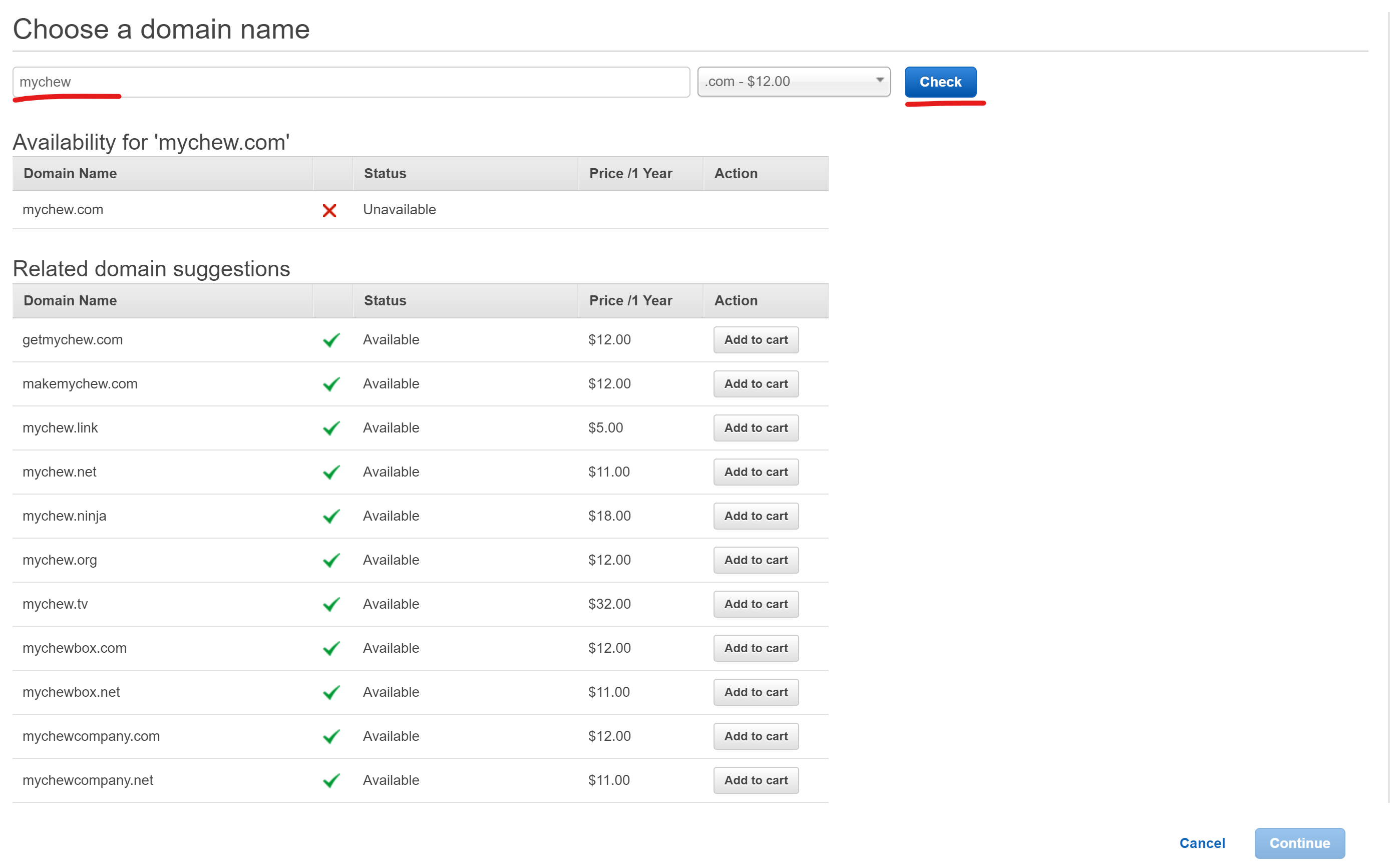 여기서 도메인 이름을 이것저것 해보면 만들 수 있는지, 불가능한지, 대체 가능한 게 뭐가 있는지 나옵니다. 추가로 가격도 나오는데, 연가 격입니다. 1년에 10달라러면.. 음 만 얼마 정도죠? 이 정도면 한국 도메인보다 쌉니다. ㅎㅎㅎ