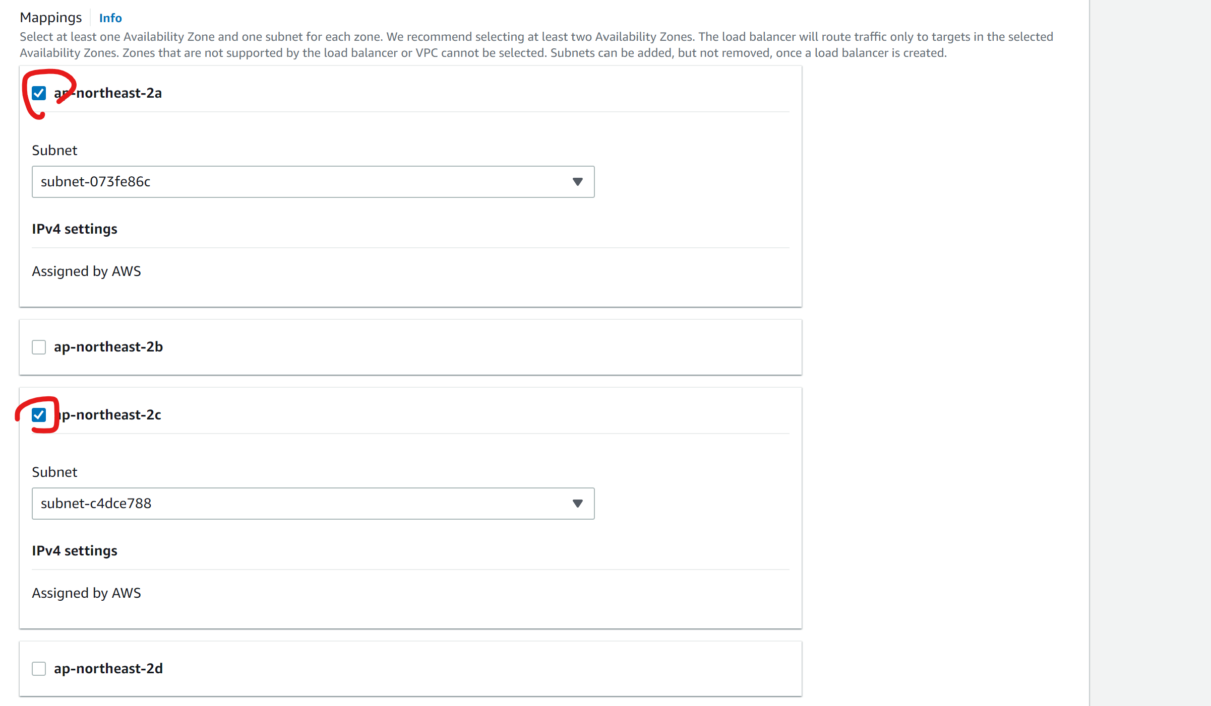 제 ec2는 ap-northeast-2c에 있기 때문에 c를 하나 고르고, 다른 건 a를 고르겠습니다.