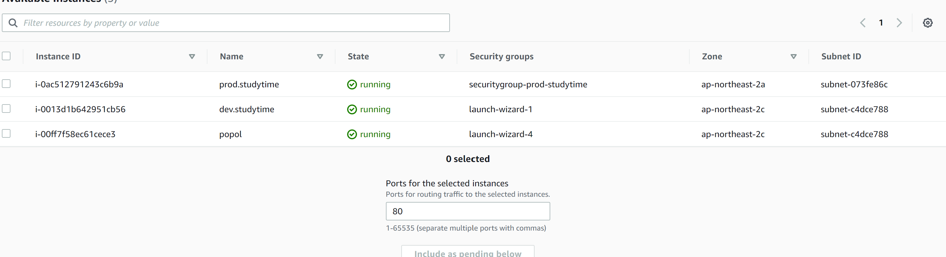 인스턴스를 선택하고 Include as pedning below를 누르면 아래로 이동합니다. 이제 create target group 버튼을 누르면 됩니다.