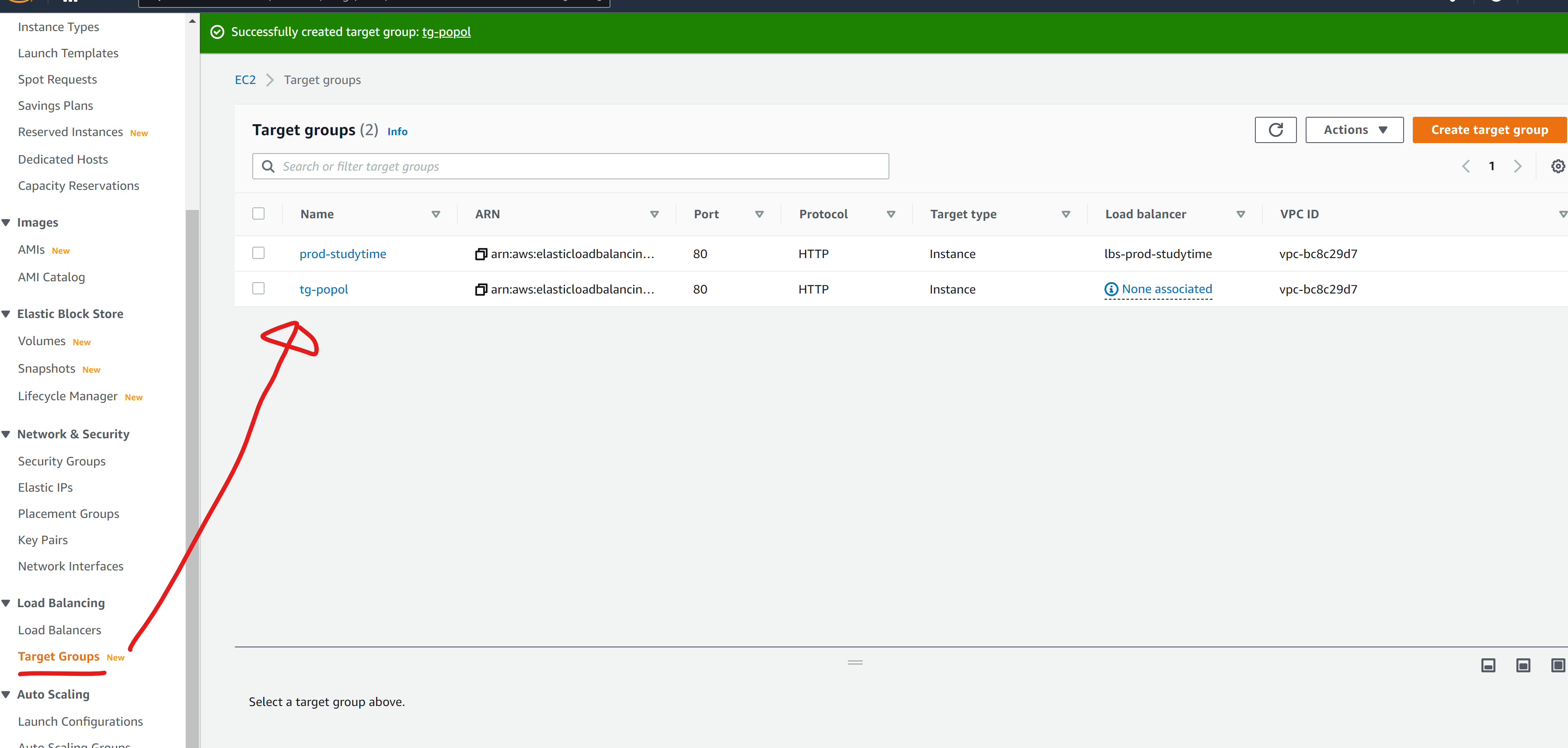마지막으로 타깃그룹이라는 것을 정해야 합니다. 타깃그룹은 우리가 만든 로드밸런서가 어떤 인스턴스들에게 연결될지 정하는 설정입니다.