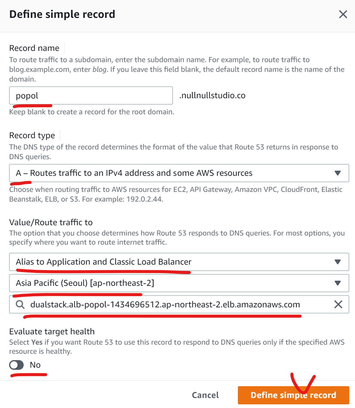 그다음이 중요한데, 서브도메인 이름과 레코드 타입, 그리고 아래 우리가 만든 ALB를 연결해주고, 헬스체크 옵션은 꺼줍니다. 우리가 따로 헬스체크 로직을 안 만들었기 때문에 ㅎㅎㅎ