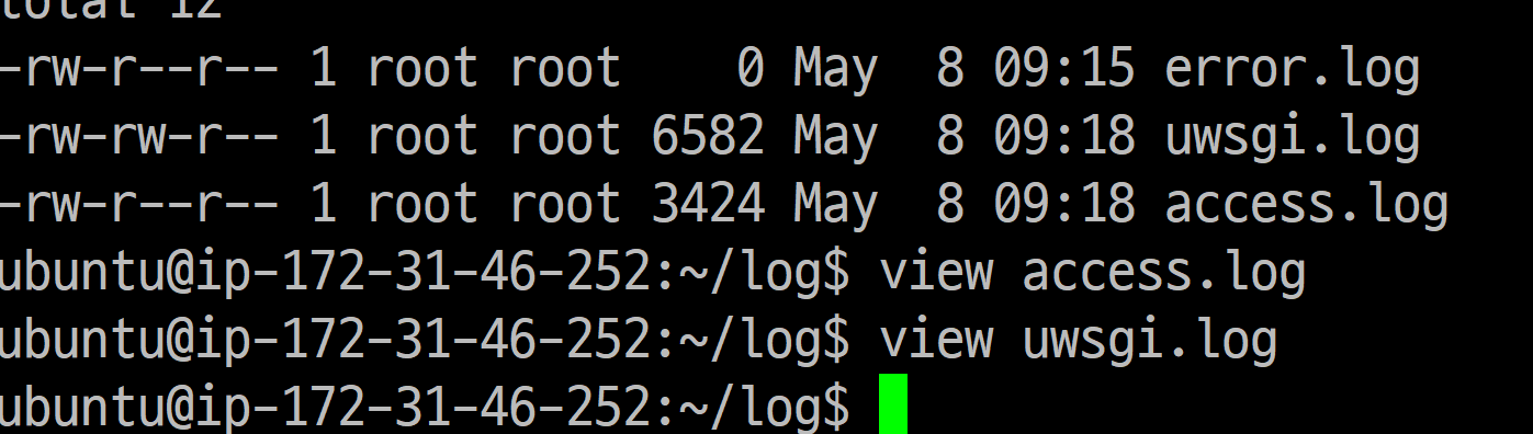 자 이제 아까와 다르게 쌩 장고가 아니라 웹서버인 nginx를 경유해서 장고가 실행 중입니다. log폴더에 가보면 access.log와 error.log가 있는데, 이 두 개는 nginx가 남기는 로그입니다. 반대로 uwsgi.log가 있는데 이건 uwsgi 즉 장고에서 남기는 로그입니다.