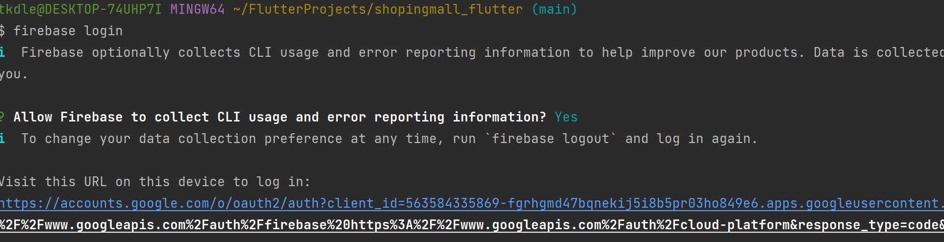 설치 완료 후 터미널에서 firebase login을 치면 cli 사용에 대해 y/n을 묻고 y를 누르면 브라우저가 뜨면서 구글 로그인을 하라고 합니다. 구글 로그인까지 완료하면 cli 설정 완료~!