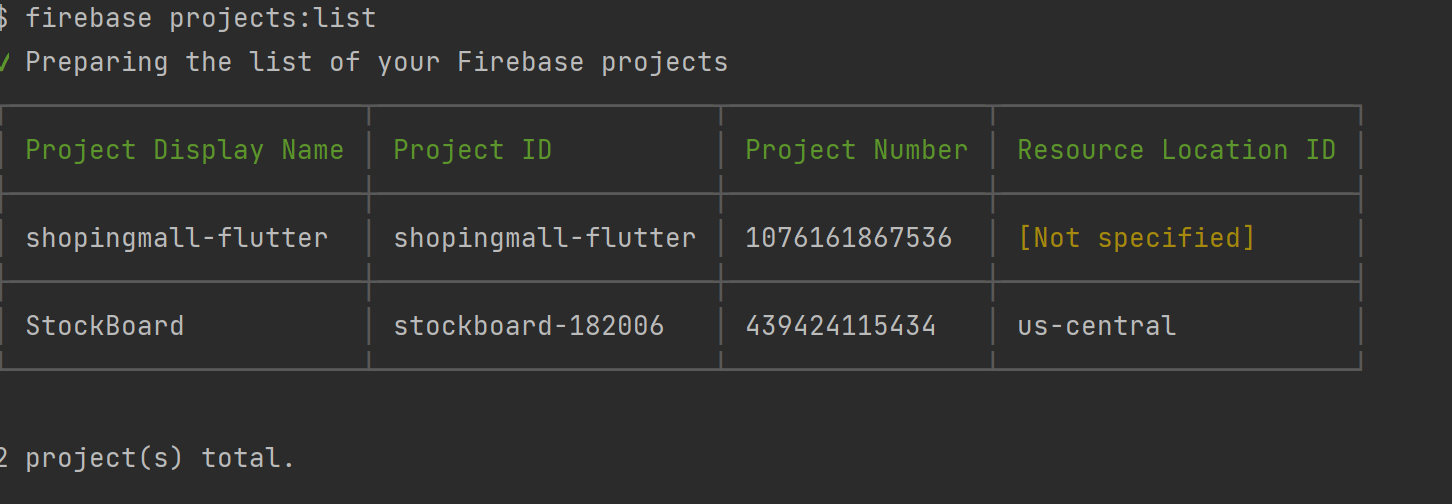 제대로 로그인이 되었는지 확인하려면 firebase projects:list를 써보면 됩니다. 현재 만들어진 프로젝트 리스트가 나오는데, 쇼핑몰이랑 옛날에 제가 만들었던 StockBoard라는 프로젝트가 나오네요 ㅋㅋ