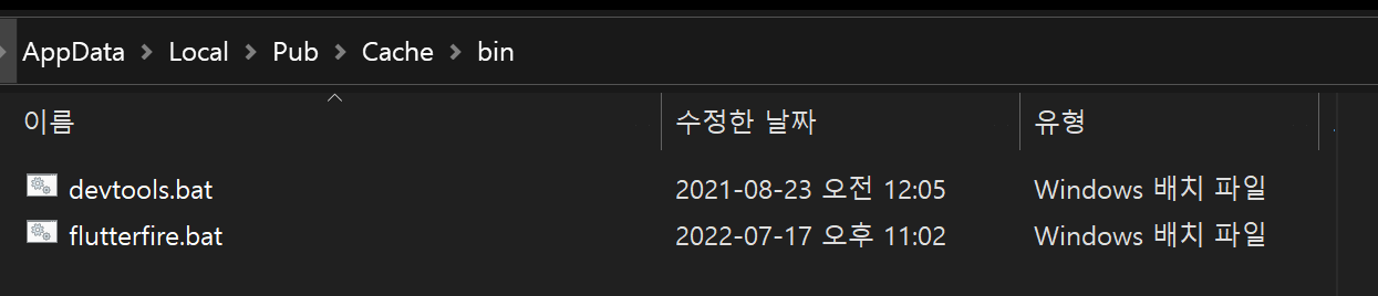근데 환경변수를 세팅해도 못 찾길래 경로 가봤더니 flutterfire.bat으로 되어있네요 ㅡㅡ 극혐이네 윈도우 ㅋㅋ