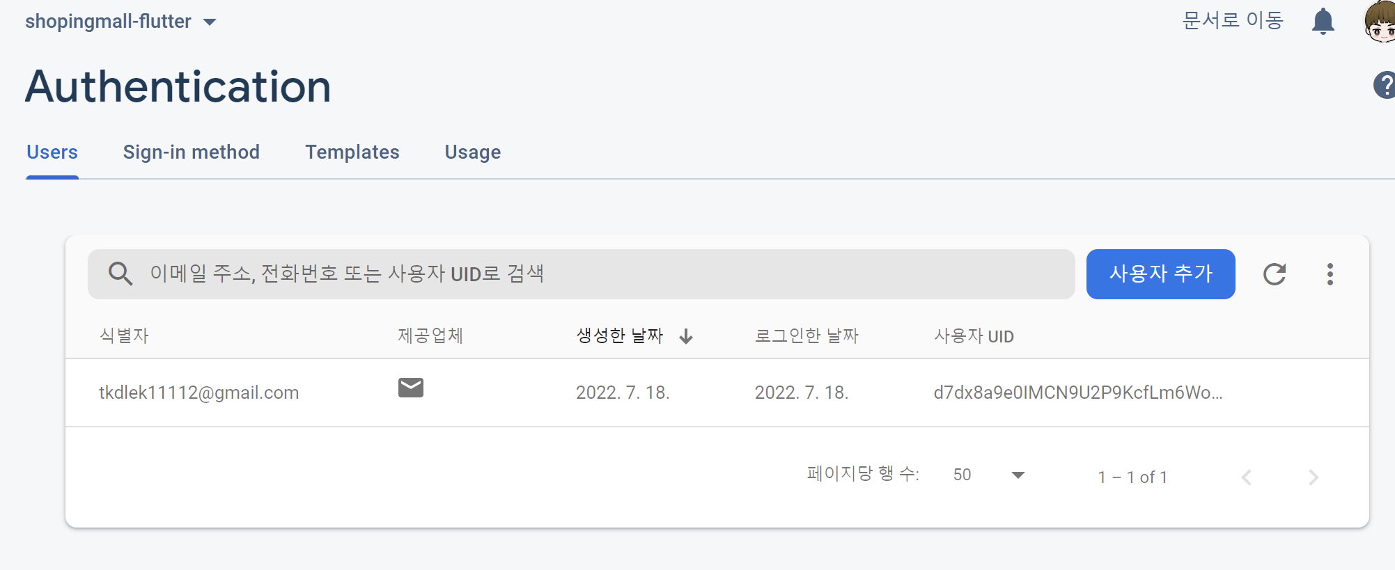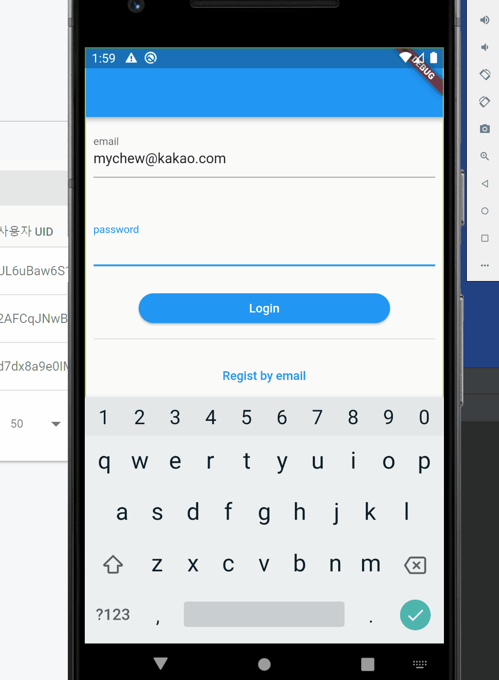 이제 실제로 실행해서 회원가입을 해봅시다. 이메일 주소를 입력하고 패스워드를 6자리 이상 입력합니다. 정상적으로 입력이 되고 파이어 베이스에도 회원 데이터가 생기는 것을 확인할 수 있습니다.
