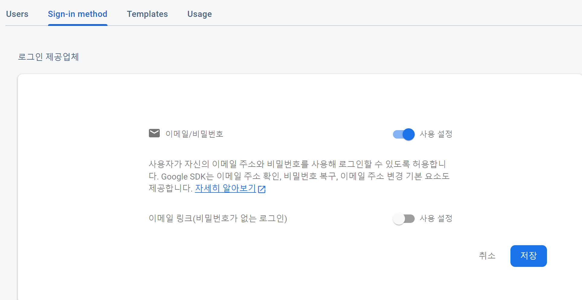 이메일/비밀번호 사용 설정을 눌렀다면 끝입니다.?! 아주 쉽죠?