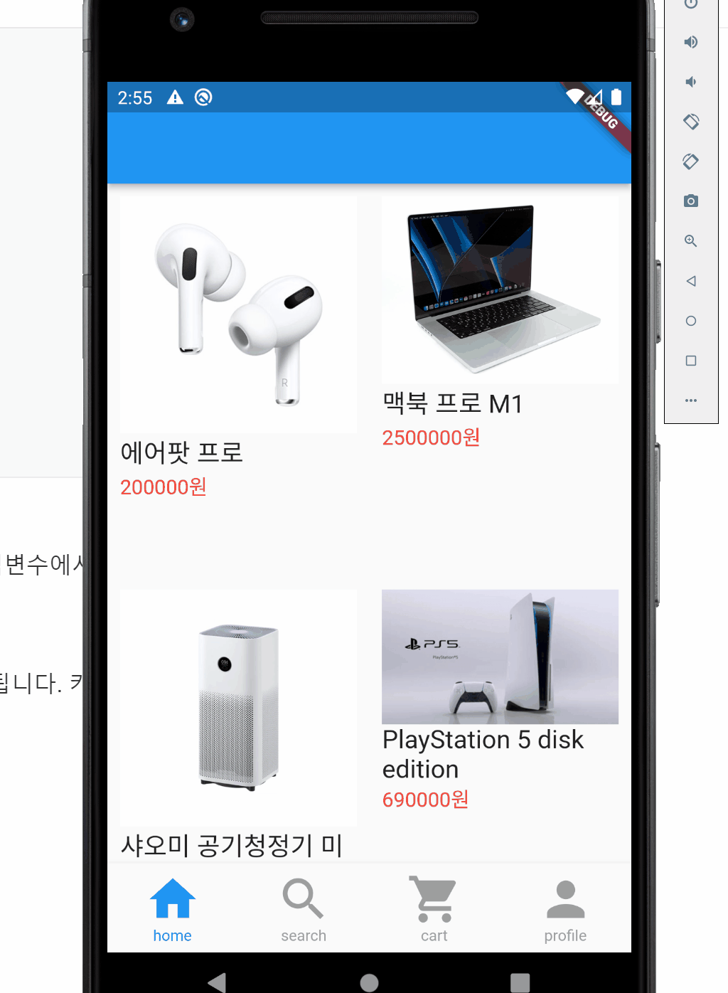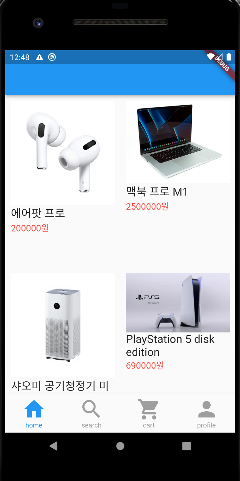 우리가 만든 쇼핑몰 앱은 하단 탭 4개를 가지고 있는데, 그중에서 홈 탭을 눌렀을 때 상품이 바둑판 형태로 정렬돼서 보이도록 하는 기능을 넣어보겠습니다.